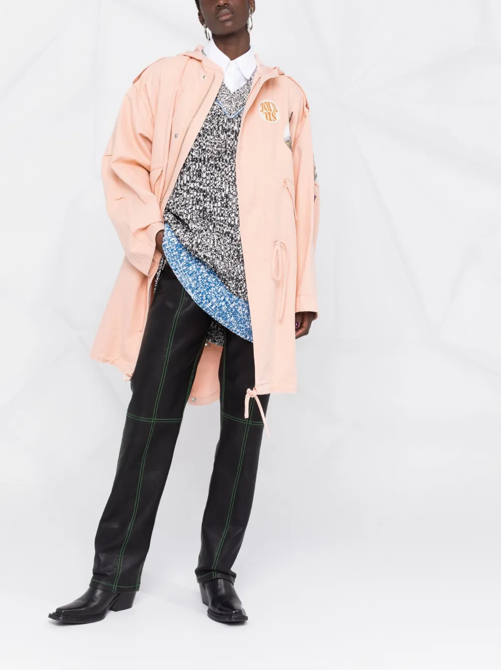 Затягивающийся на шнурок капюшон, эполеты, потайная застежка спереди, нашивка, декор в виде значка, длинные рукава, передние карманы с клапаном, пояс на шнурке, закругленный подол и длина миди.
