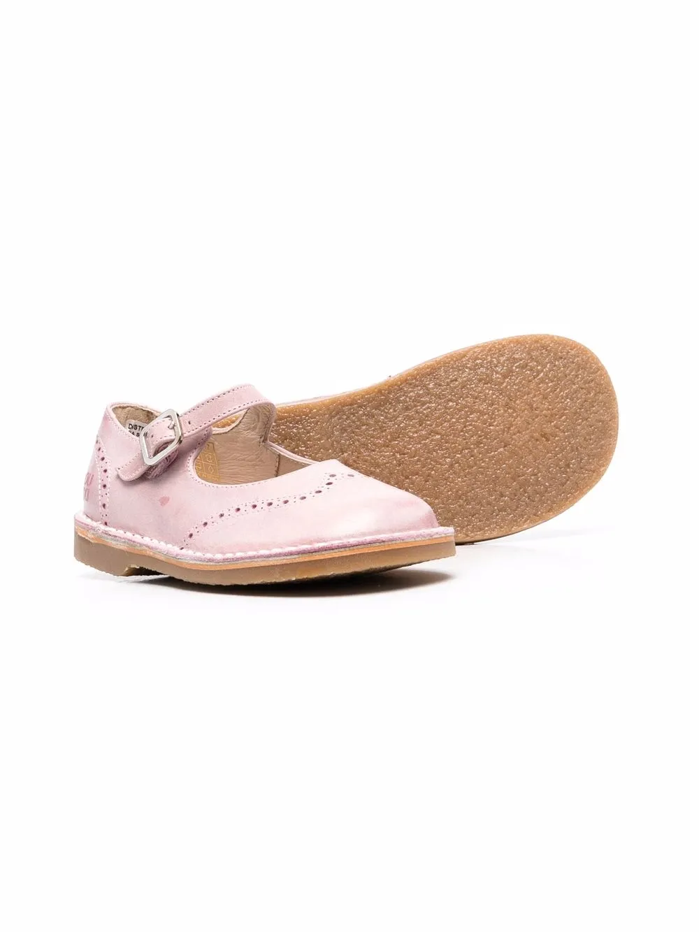 Брогирование, закругленный носок, боковые застежки с пряжками, стелька с логотипом и плоская резиновая подошва.