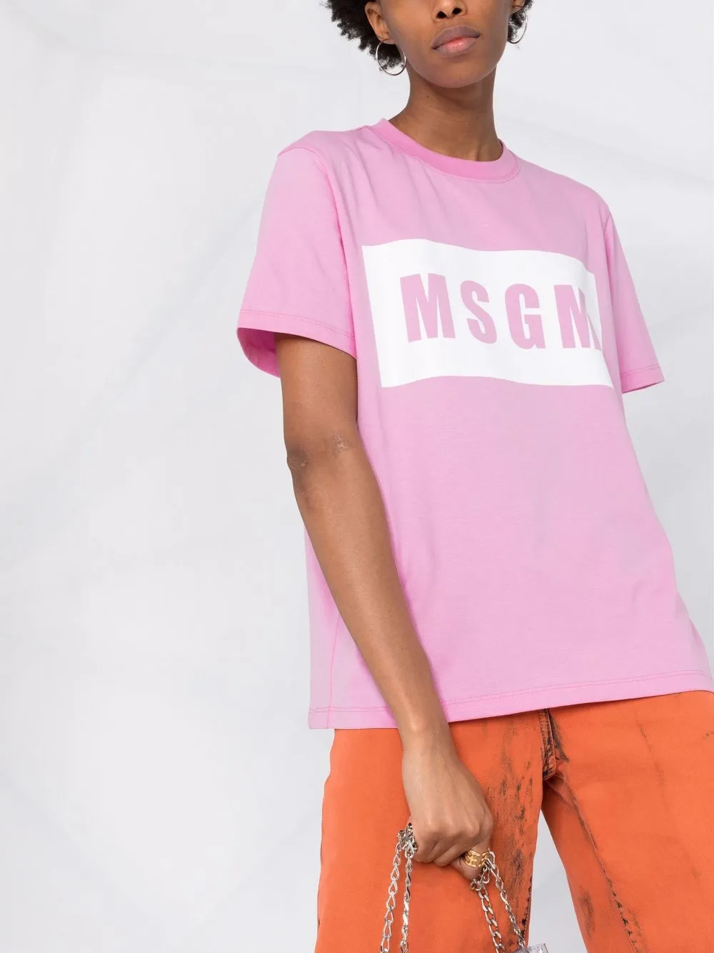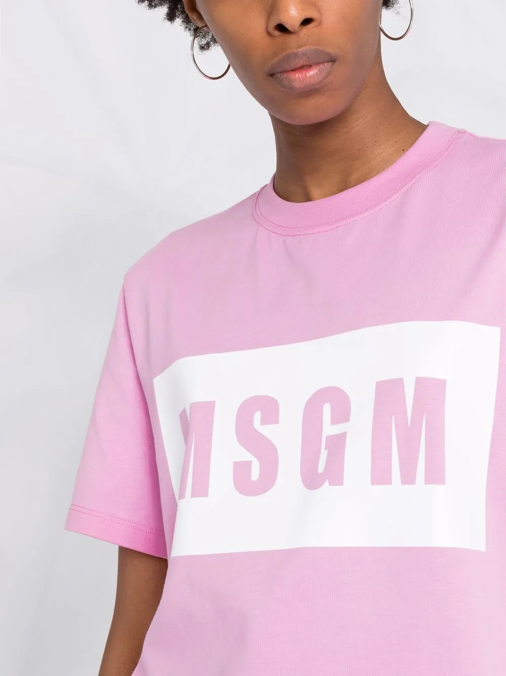Логотип спереди, круглый вырез, короткие рукава и прямой подол. Цвет: розовый.