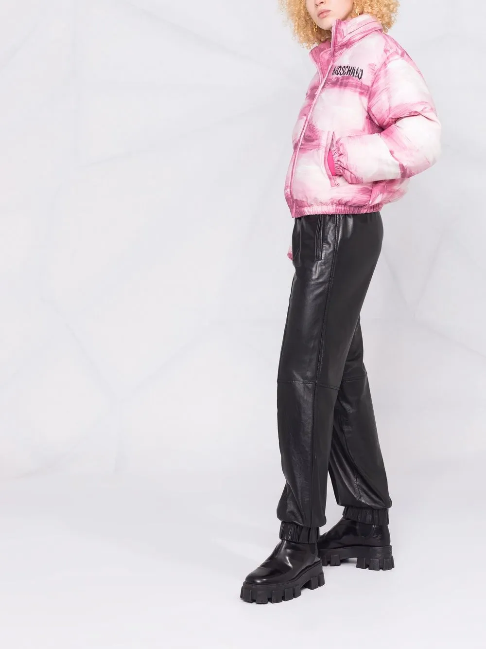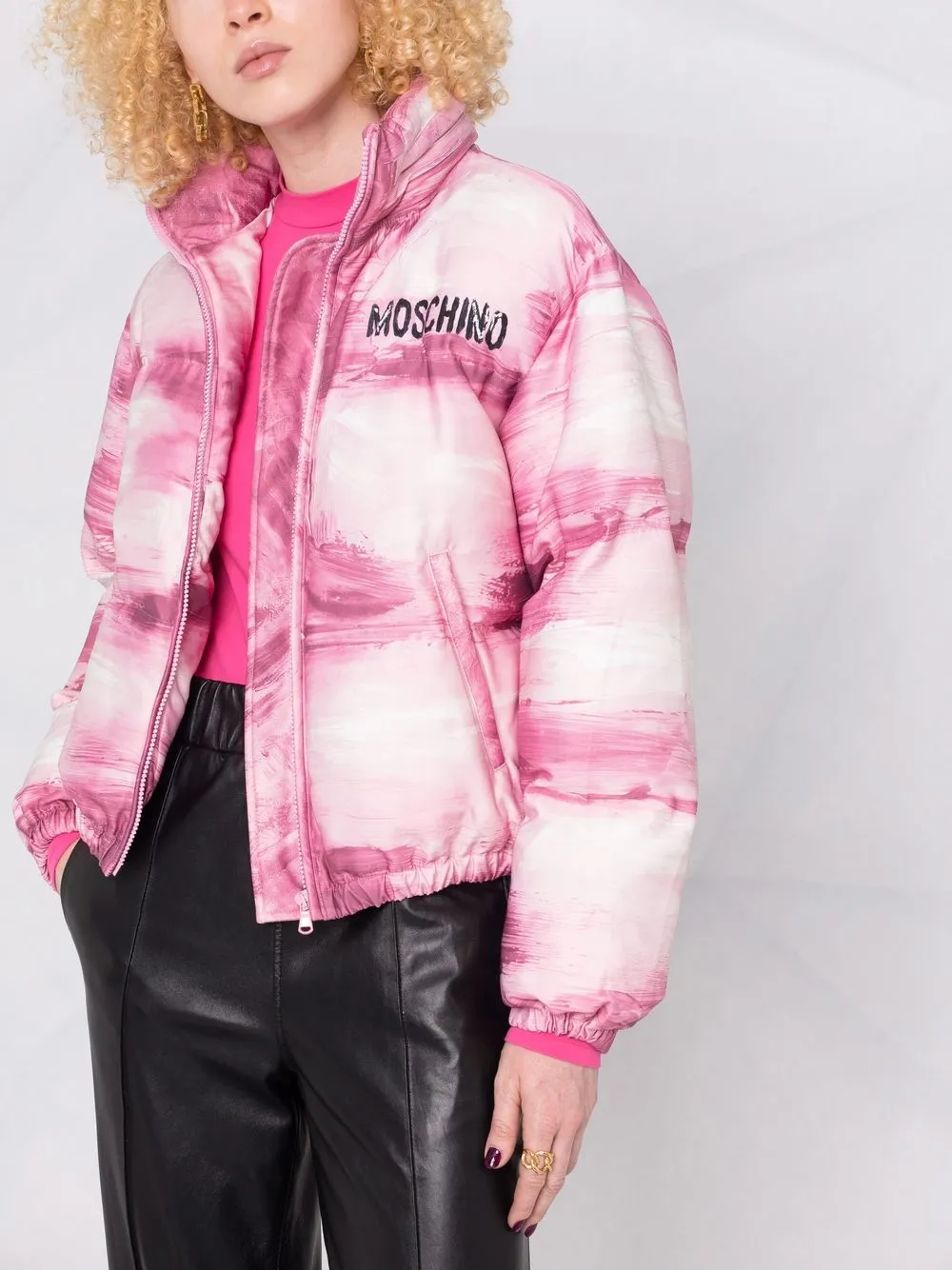 Дутый материал, воротник-стойка, застежка на молнии спереди, принт с логотипом на груди, два прорезных кармана по бокам, длинные рукава, эластичные манжеты и эластичный подол.