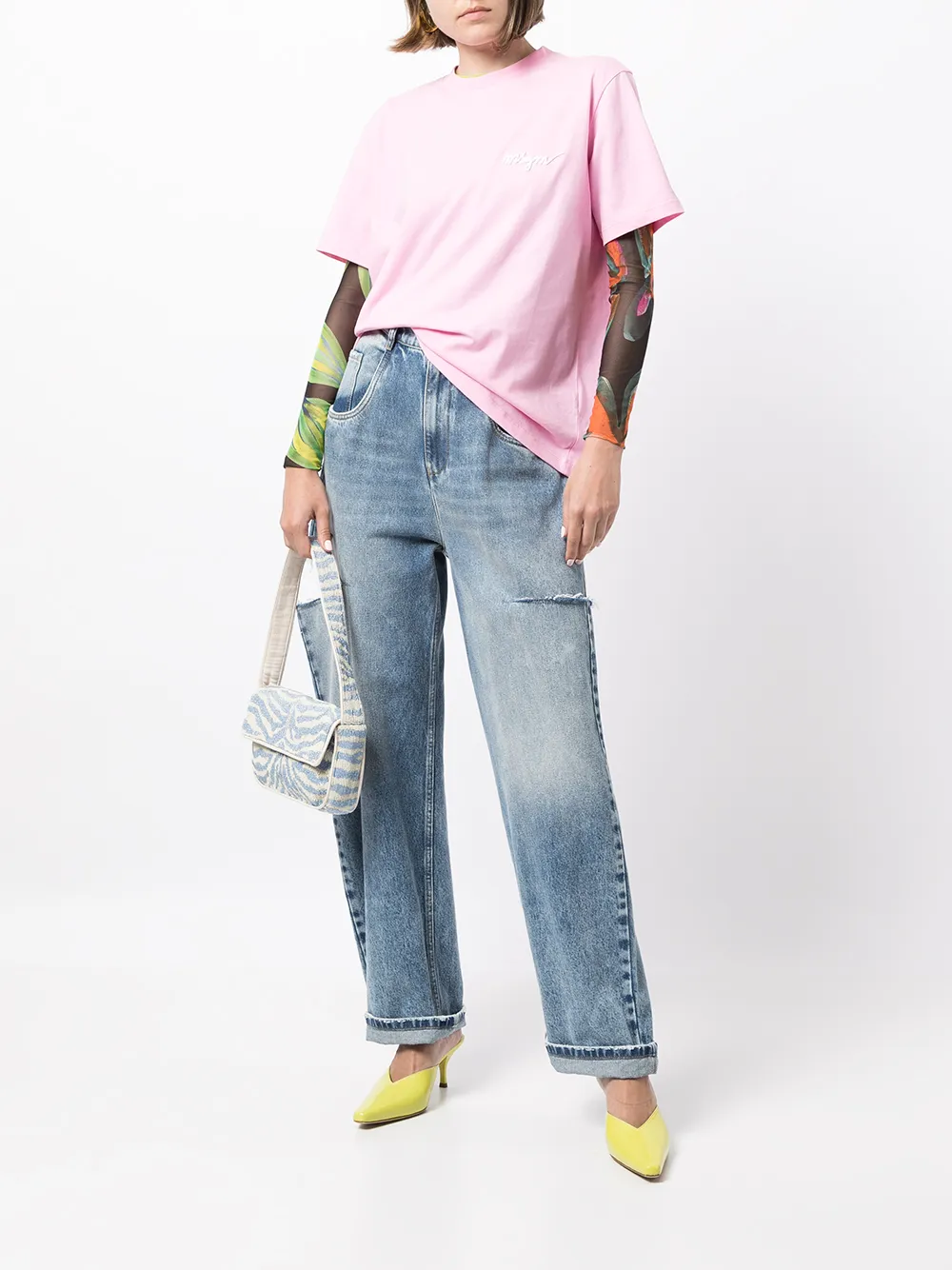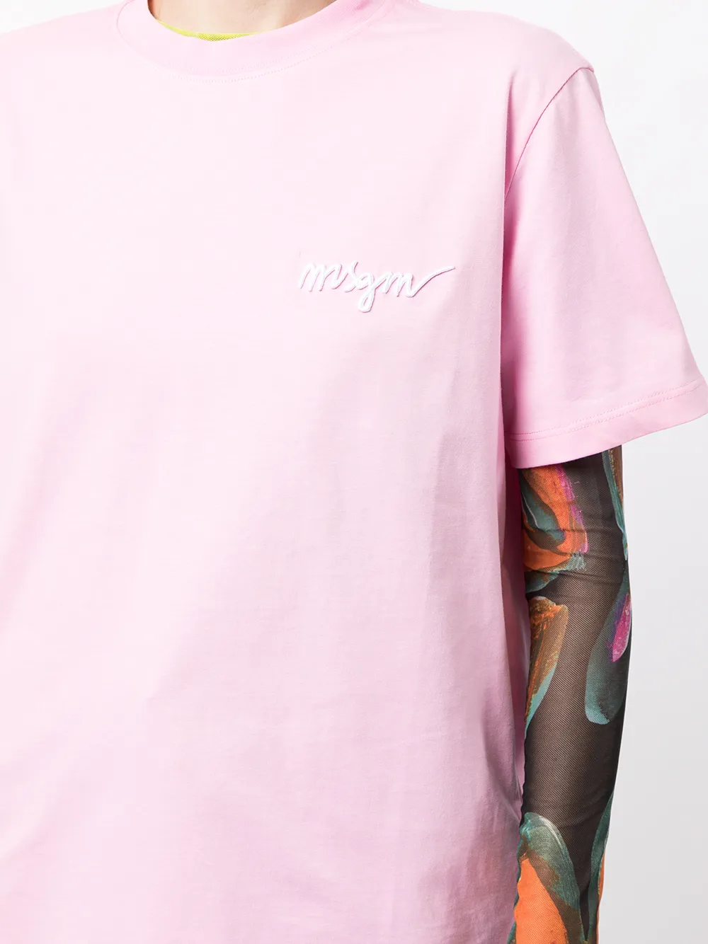 Принт с логотипом на груди, круглый вырез, короткие рукава и прямой подол. Цвет: розовый.