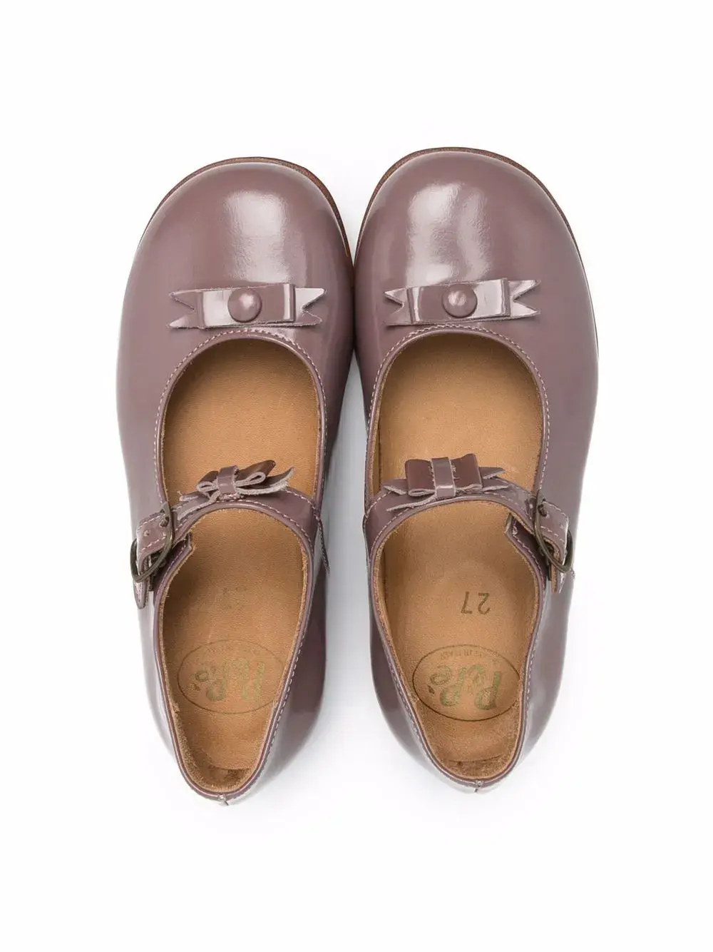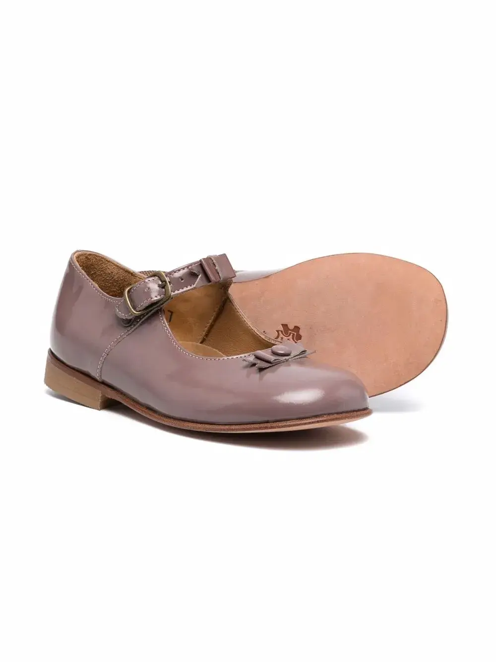 Бант, закругленный носок, застежка на пряжке и плоская резиновая подошва.