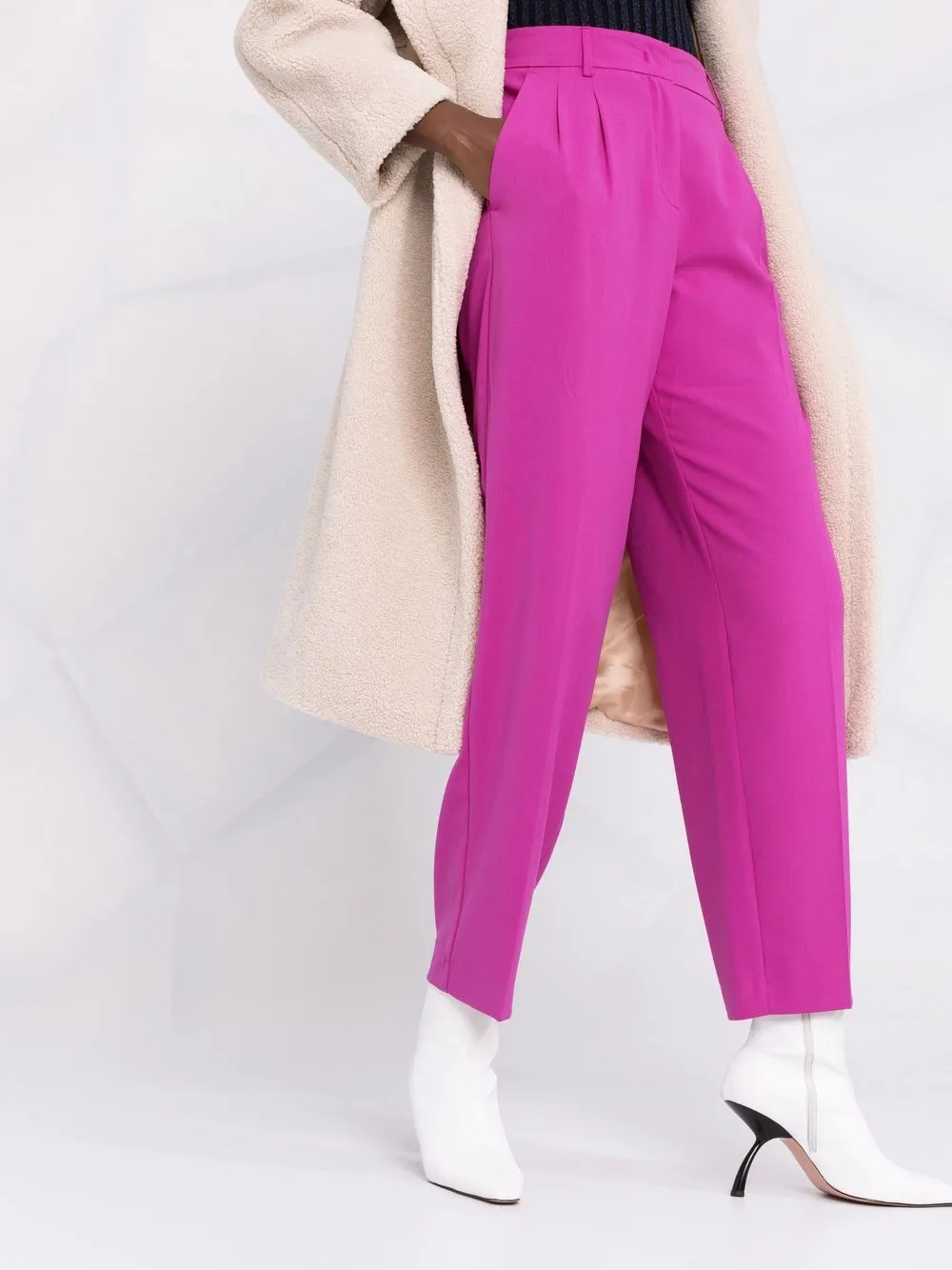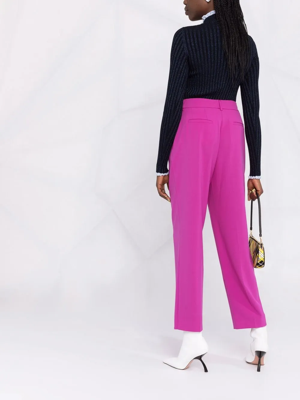 Стрелки, петли для ремня, потайная застежка спереди, два вшитых кармана по бокам и два кармана с листочкой сзади. Цвет: розовый.