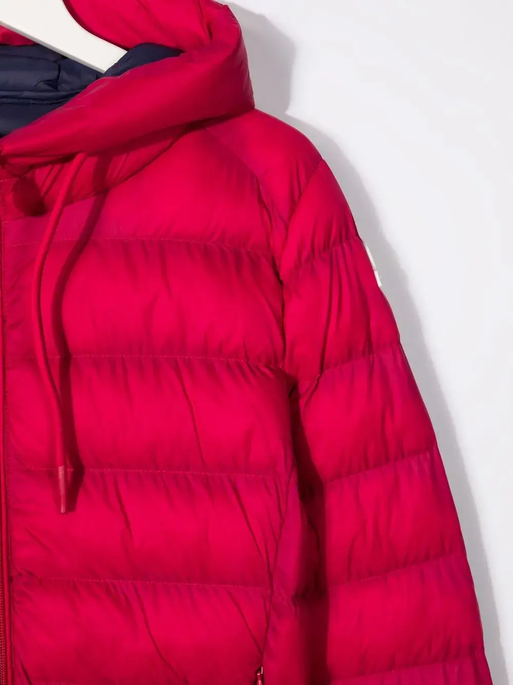 Дутый материал, затягивающийся на шнурок капюшон, застежка на молнии спереди, длинные рукава, прямой подол и два кармана на молнии. Цвет: красный.