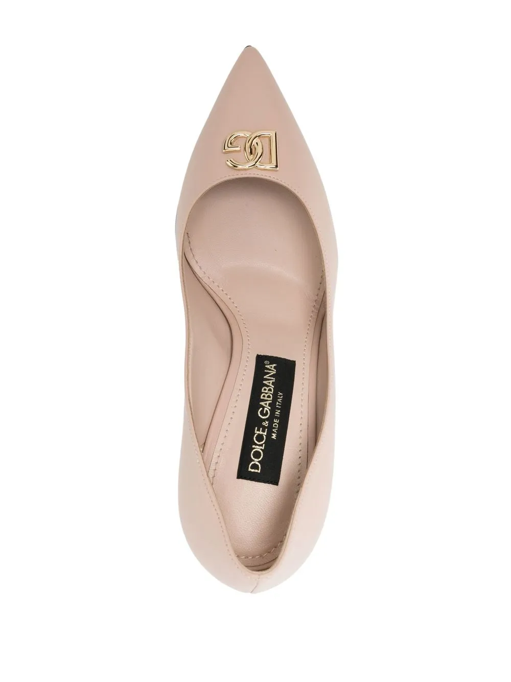 Золотистый металлический логотип, заостренный носок, стелька с логотипом и высокий каблук.