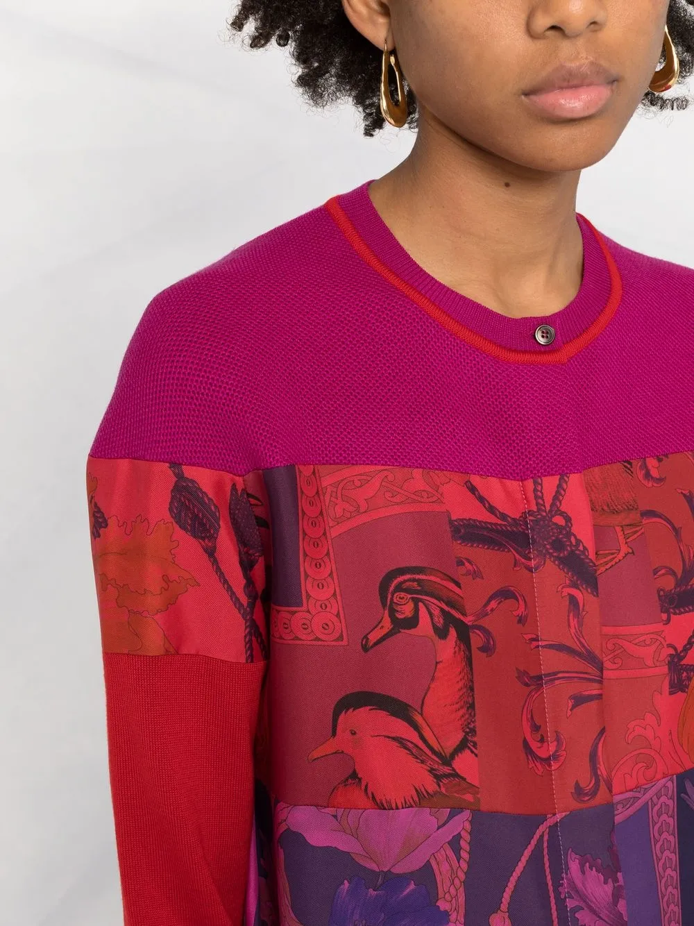Ярко-розовый, смесь шерсти и шелка, вставки, трикотажный материал, круглый вырез, застежка на пуговицах спереди, длинные рукава и вязаные края в рубчик.