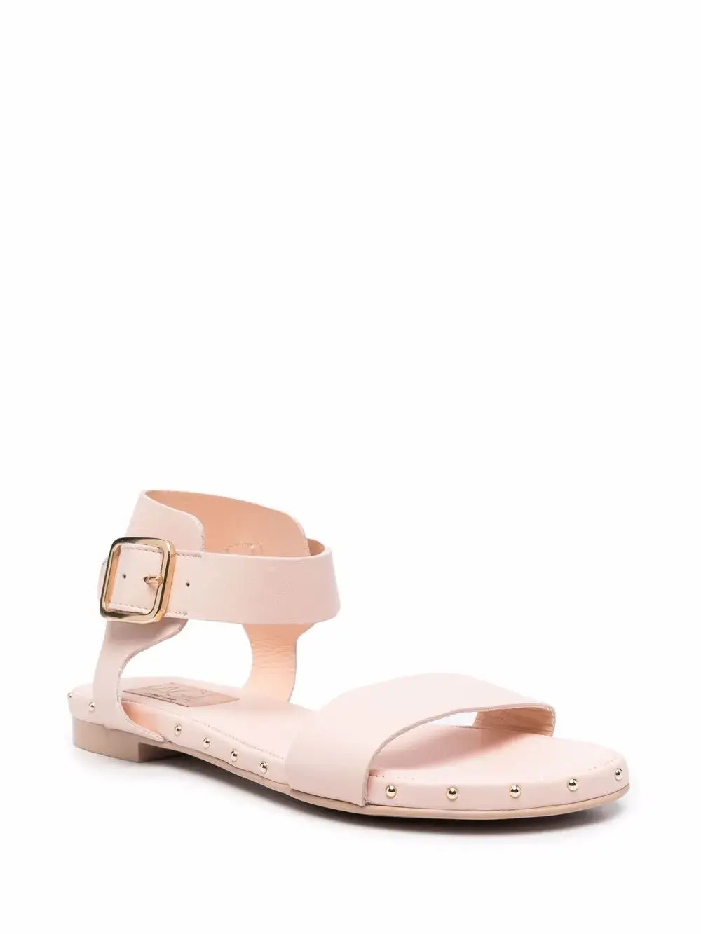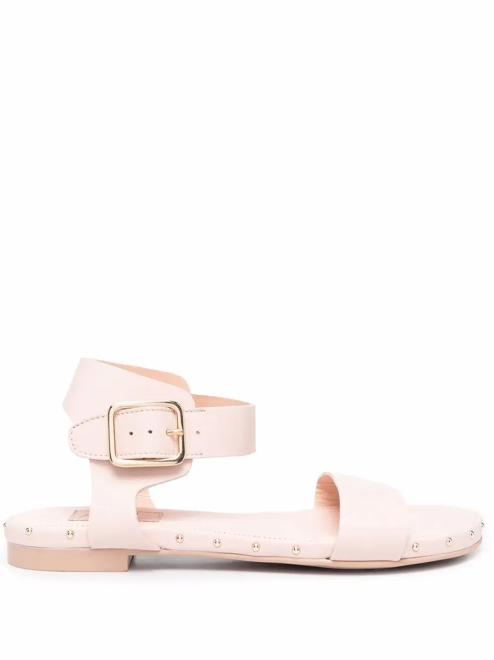 Кожаная подкладка, заклепки, открытый носок, ремешок на щиколотке с пряжкой, стелька с логотипом, низкий каблук и резиновая подошва.