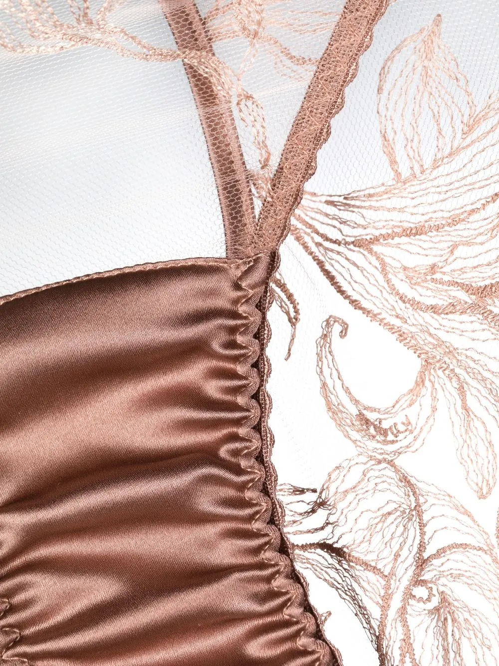 Розовый, смесовый шелк, эластичный материал, кружевные вставки, вырез сзади и высокий вырез. Эту вещь можно примерить, но только поверх собственного белья.