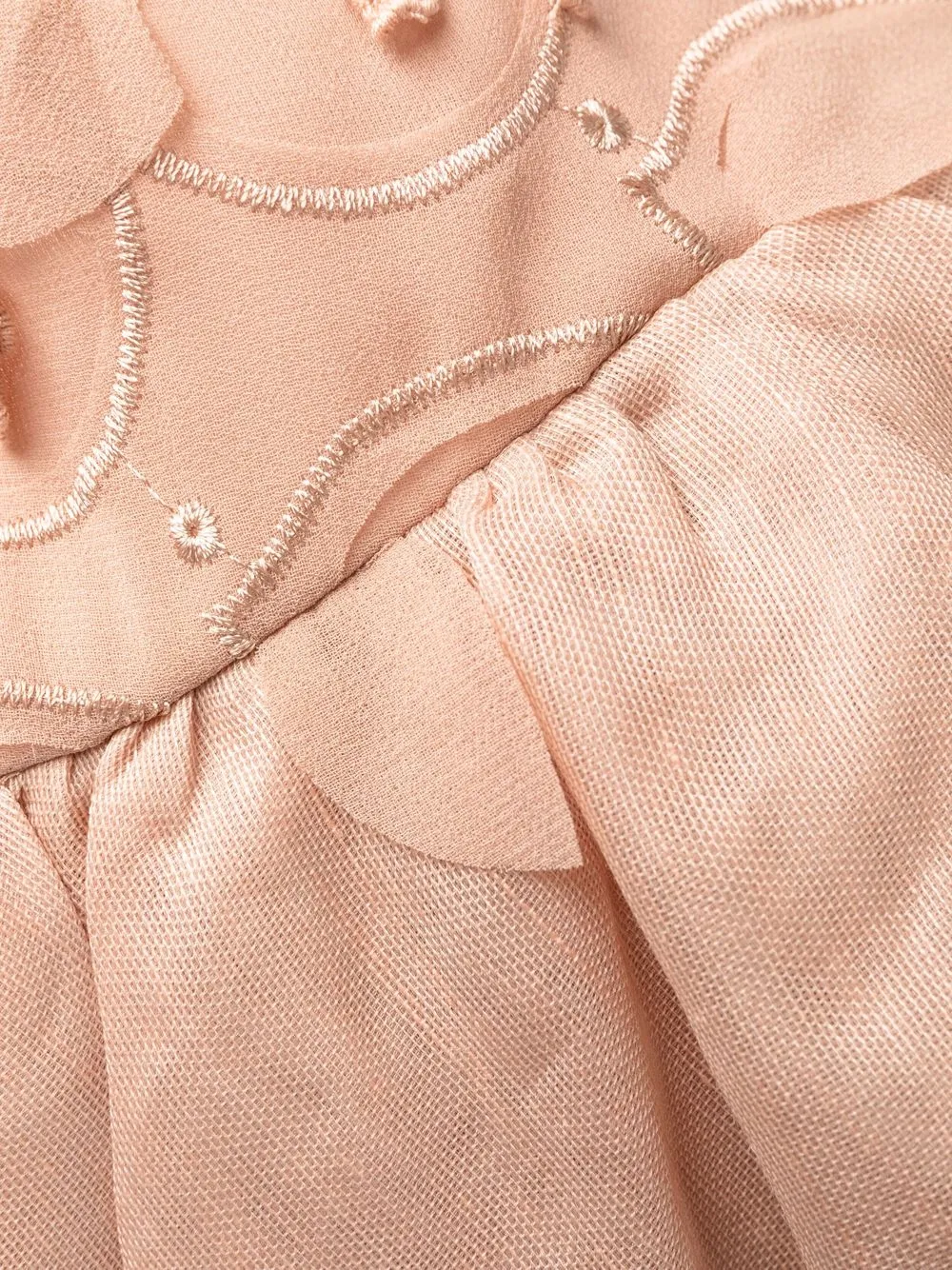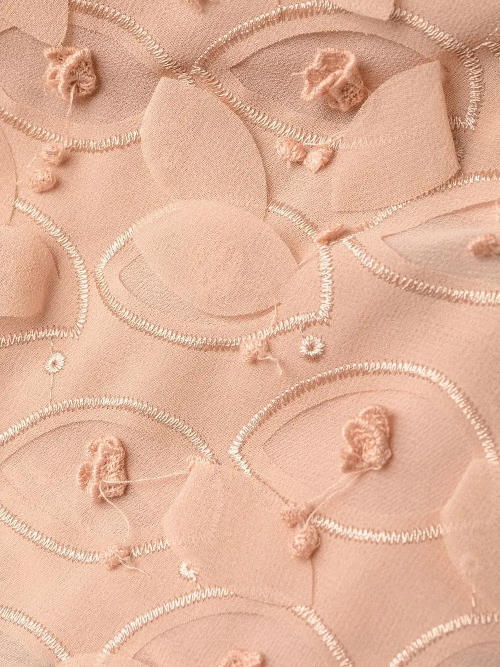 Расцветка Blush Pink, жоржет, открытая спина, застежка на пуговицы сзади, потайная застежка на молнии сзади, цельная подкладка и аппликация.