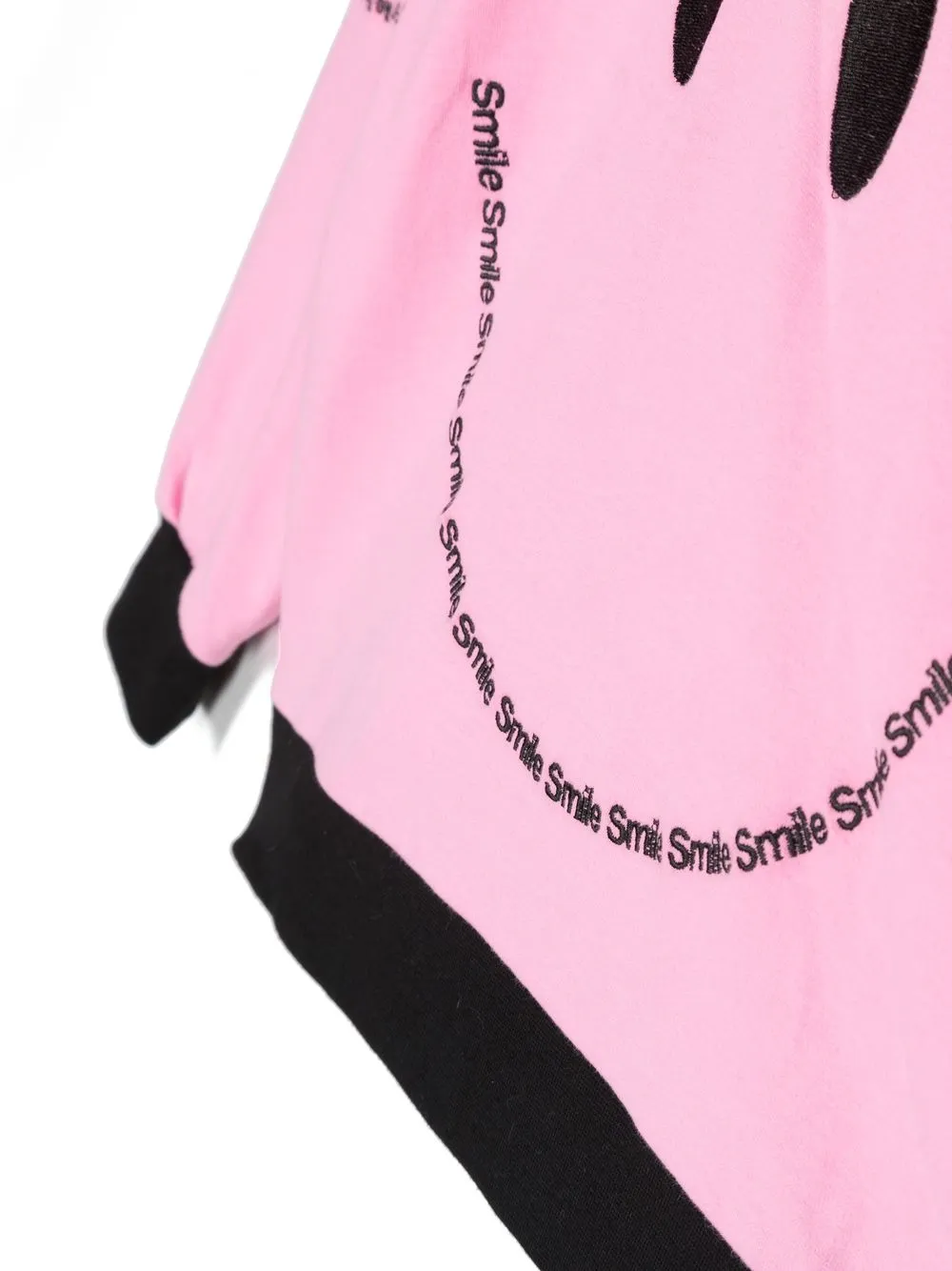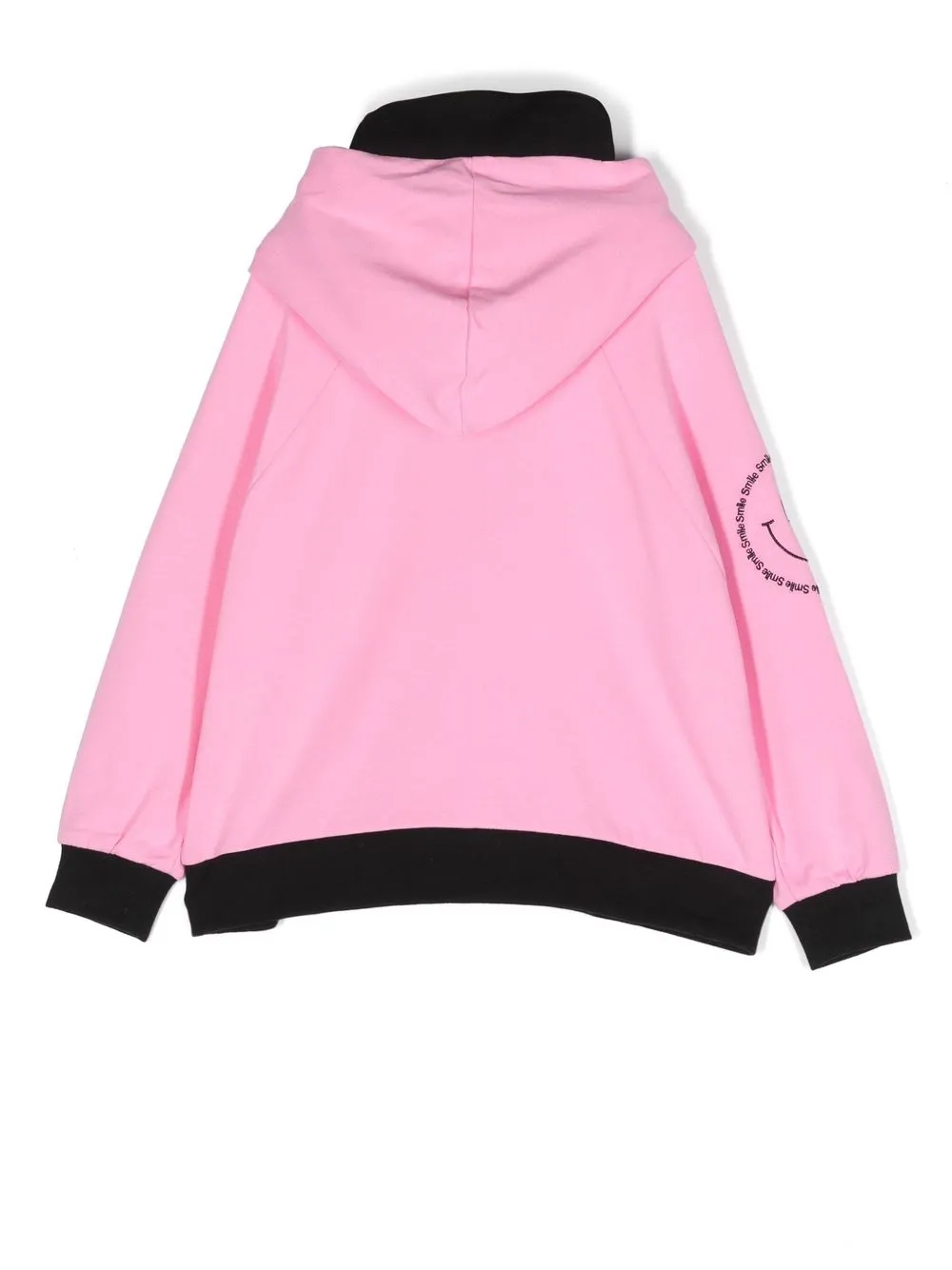 Розовый, черный, хлопок, флисовый материал, сочетание двух оттенков, вышивка, принт с изображением смайла, классический капюшон, длинные рукава и прямой подол.