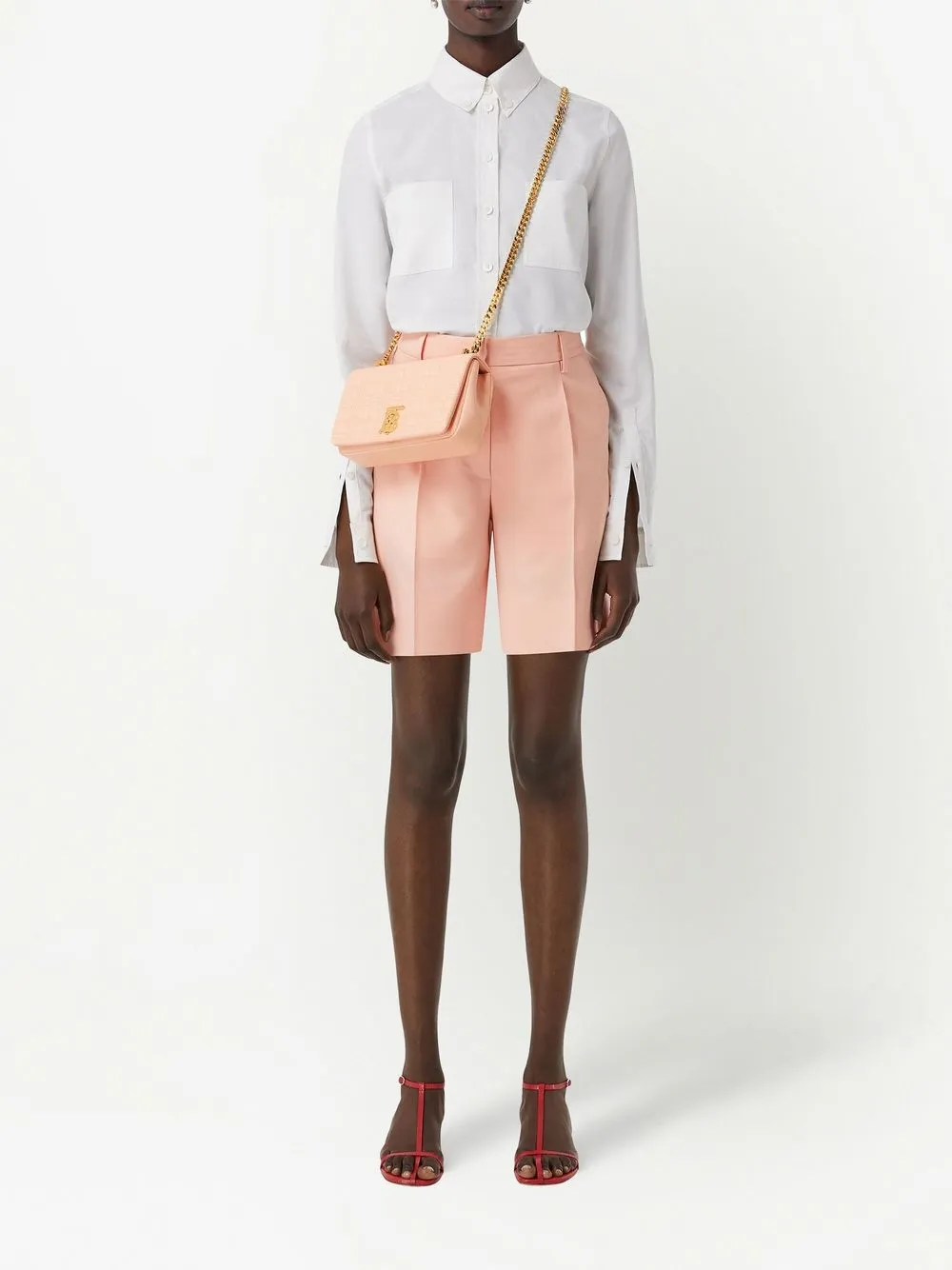 Персик, розовый, овечья кожа, ремень на плечо с цепочной деталью, золотистый металлический логотип, строчка в тон, откидной клапан на магните, основное отделение и тисненый логотип внутри.