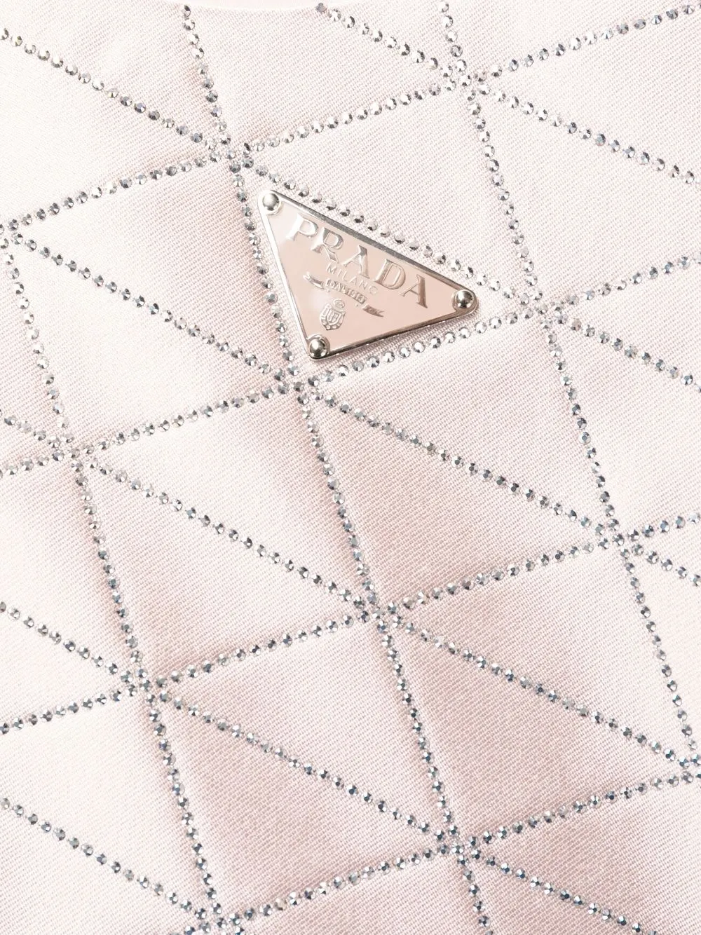 Светло-розовый, смесь шерсти и шелка, украшения из горного хрусталя, U-образный вырез, без рукавов и треугольный логотип.