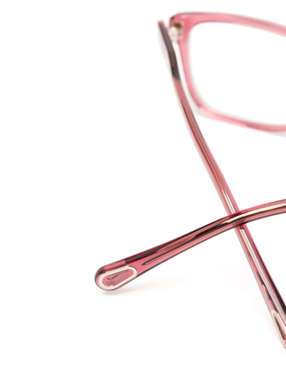 Темно-розовый, ацетат, прямоугольная оправа, прозрачные линзы и закругленные дужки. Обратите внимание, что на FARFETCH продаются оправы с линзами без диоптрий.