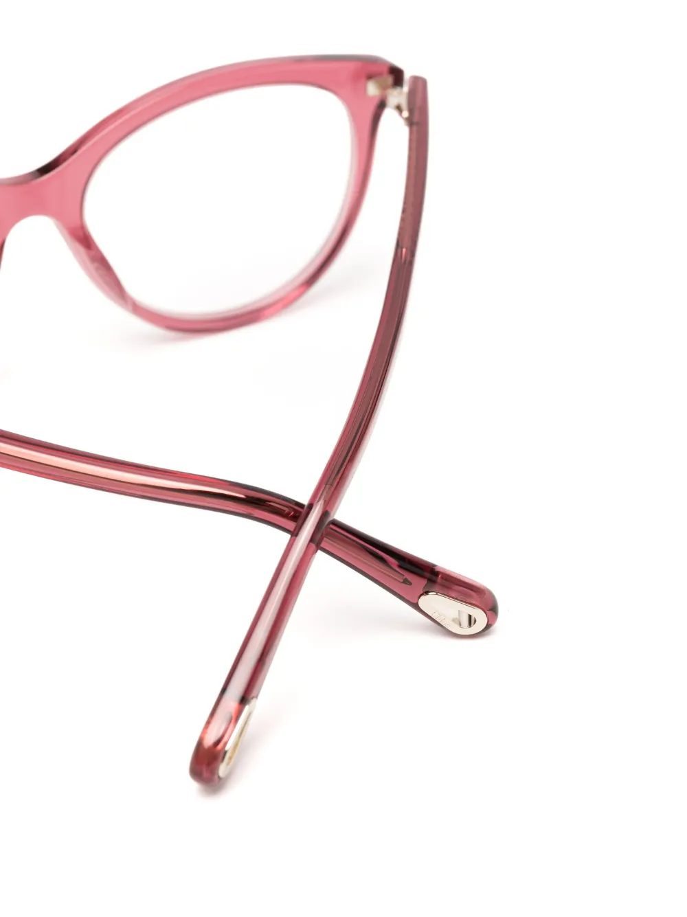 Розовый, круглая оправа, прозрачные линзы, золотистый логотип, прямые дужки и дужки с закругленными концами. В комплект входит защитный чехол для очков.