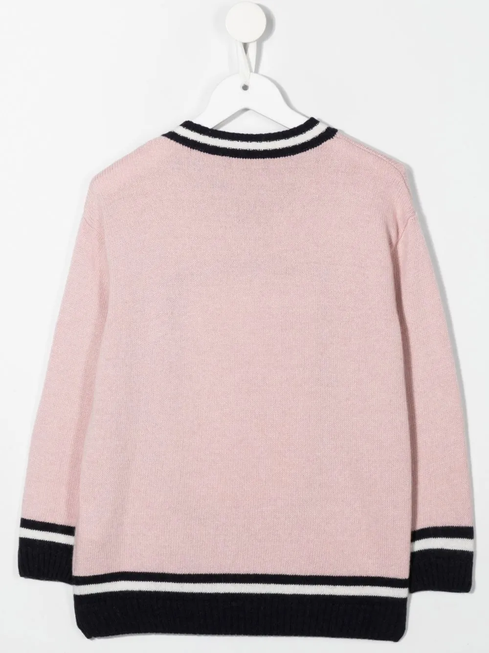 Розовый, черный, кремово-белый, смесь шерсти и кашемира, трикотажный материал, логотип в технике интарсия, V-образный вырез, контрастная отделка, отделка в рубчик, длинные рукава и прямой подол.
