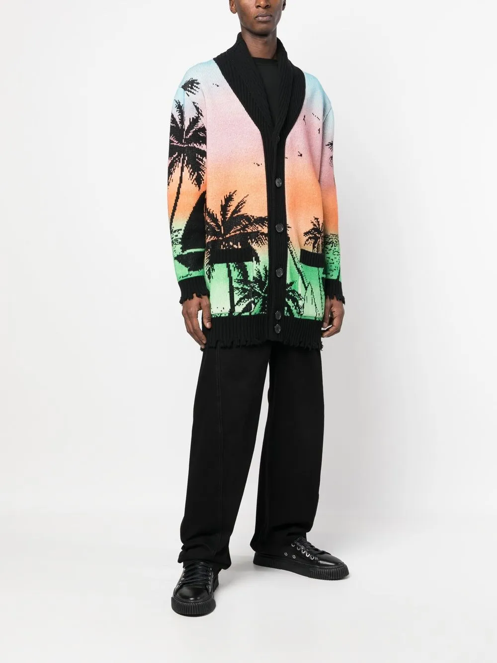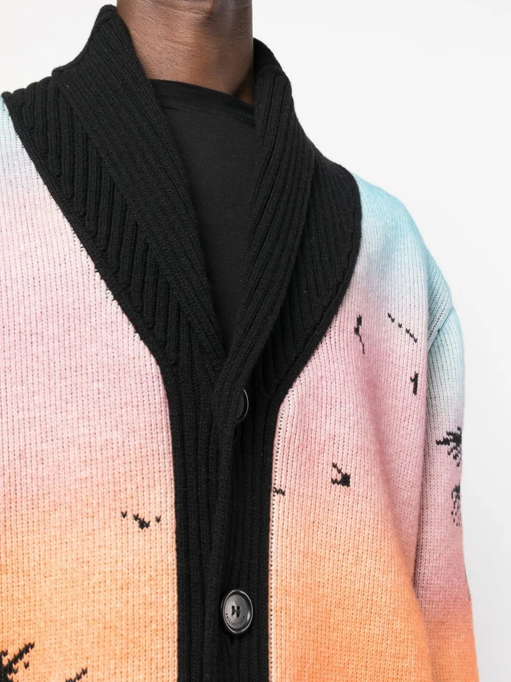 Черный/разноцветный, овечья шерсть, смесь шерсти и хлопка, трикотажный материал, трикотаж в крупный рубчик, сплошной графичный принт, нашивка с логотипом сзади, лацканы-шалька, застежка на пуговицах спереди, приспущенные плечи, длинные рукава и прямой подол.