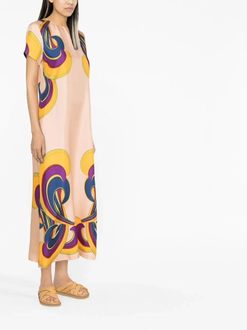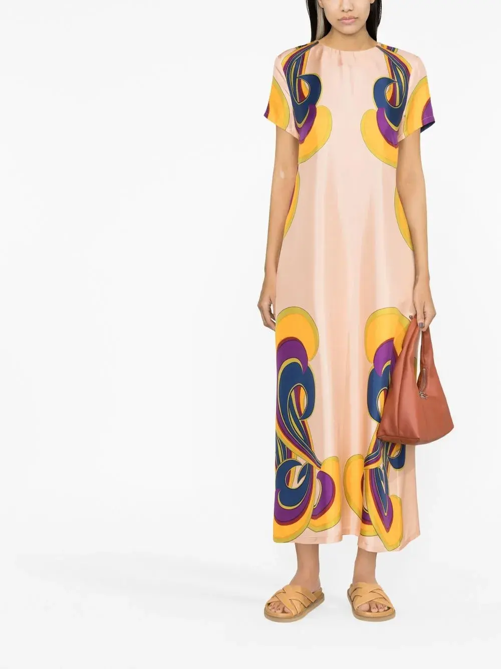 Шелк, сплошной графичный принт, круглый вырез и короткие рукава.