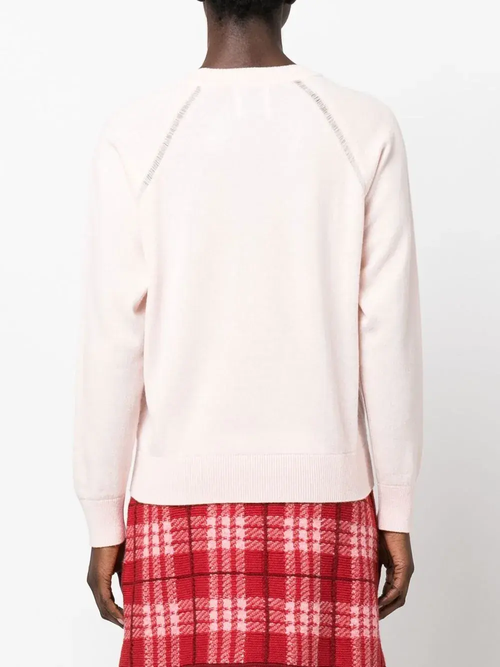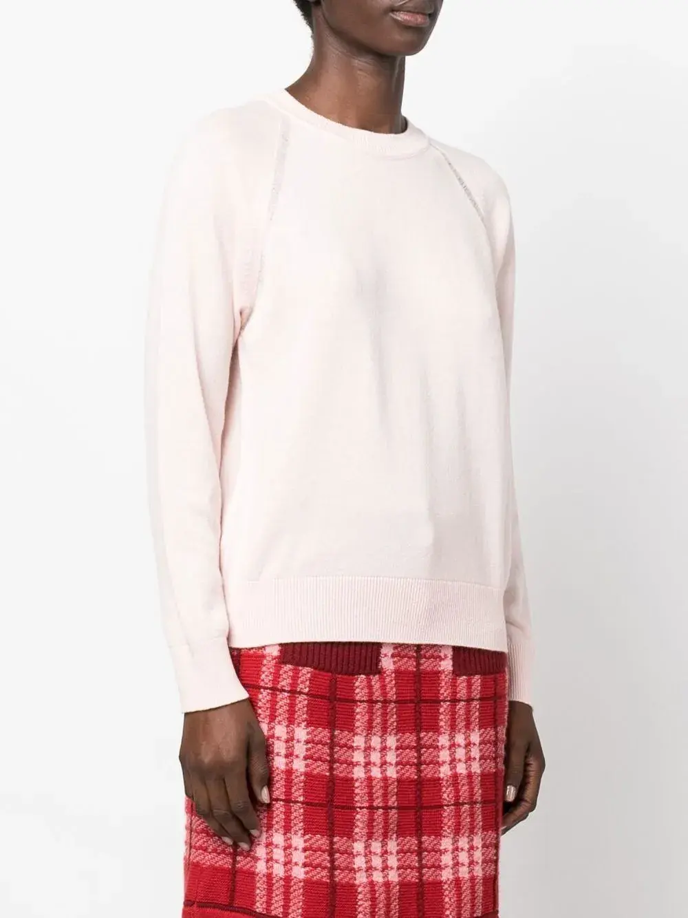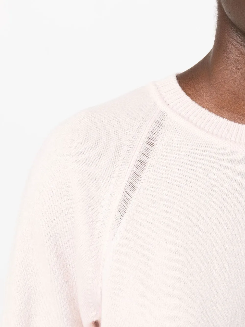 Пудрово-розовый, кашемир, круглый вырез, длинные рукава и вязаные края в рубчик.