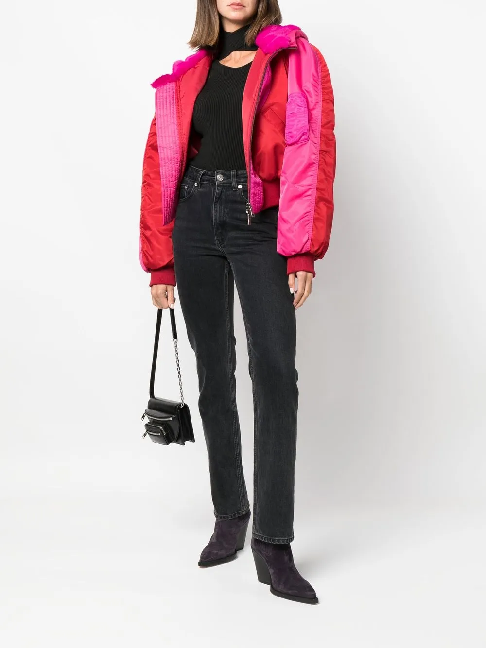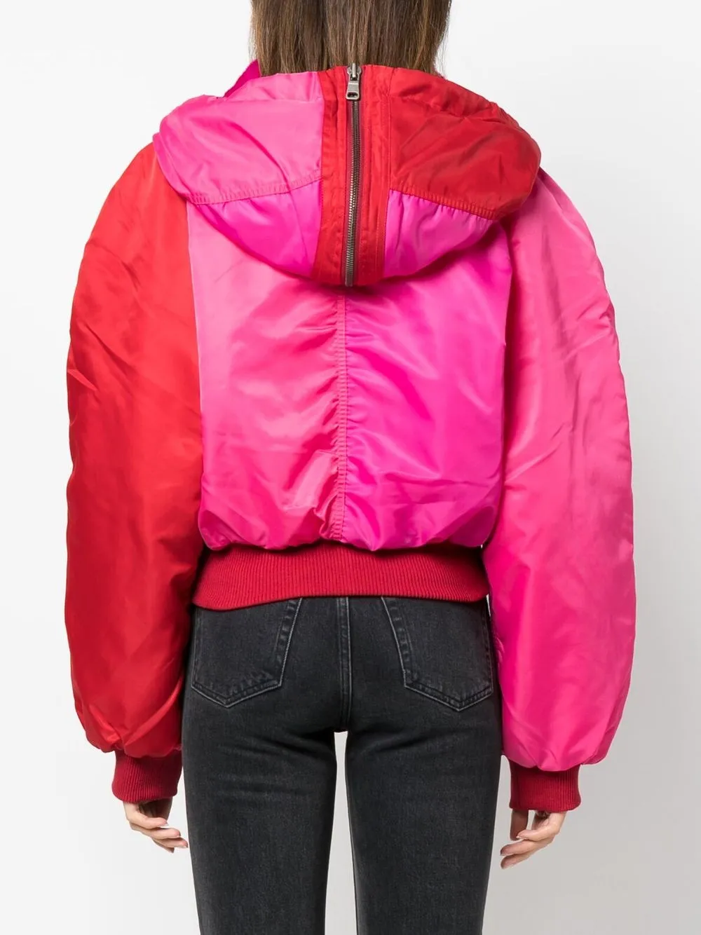 Фуксия, ярко-красный, стиль колор-блок, дутый материал, двусторонняя молния спереди, классический капюшон, два боковых кармана с застежкой на кнопки, манжеты в рубчик и подол в рубчик.