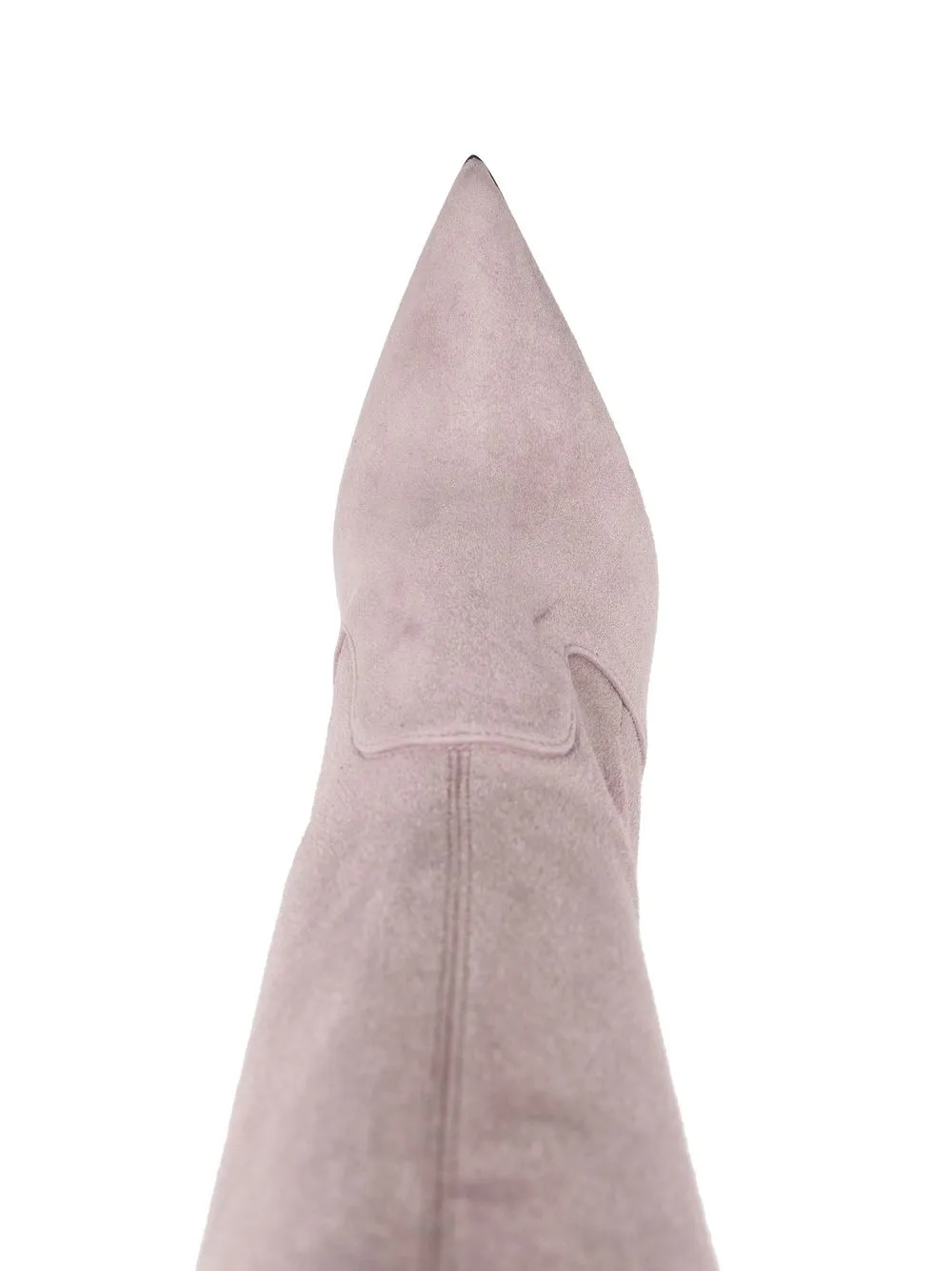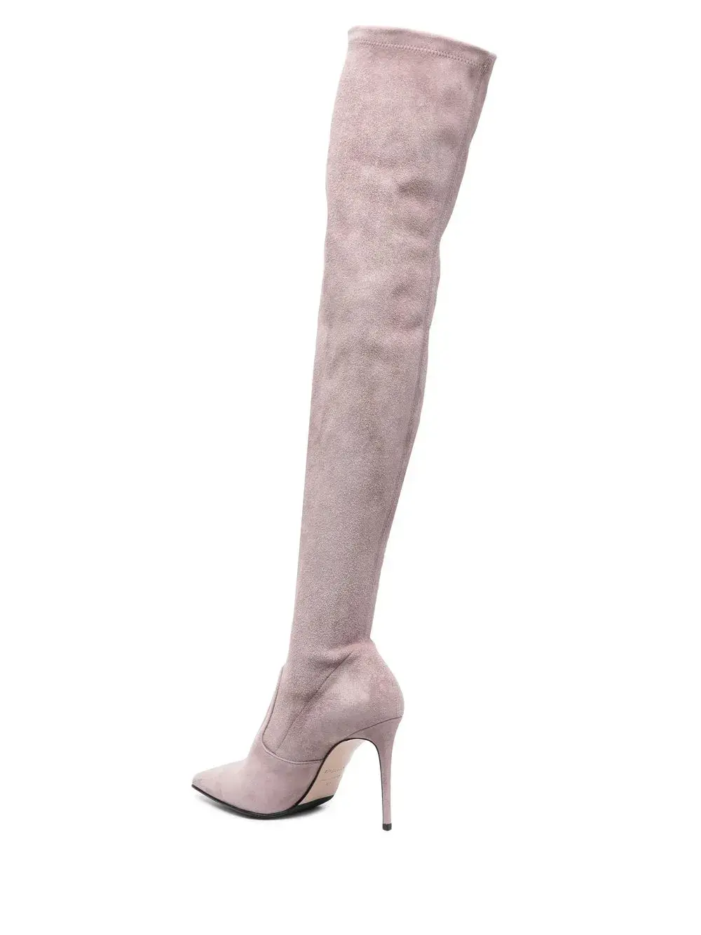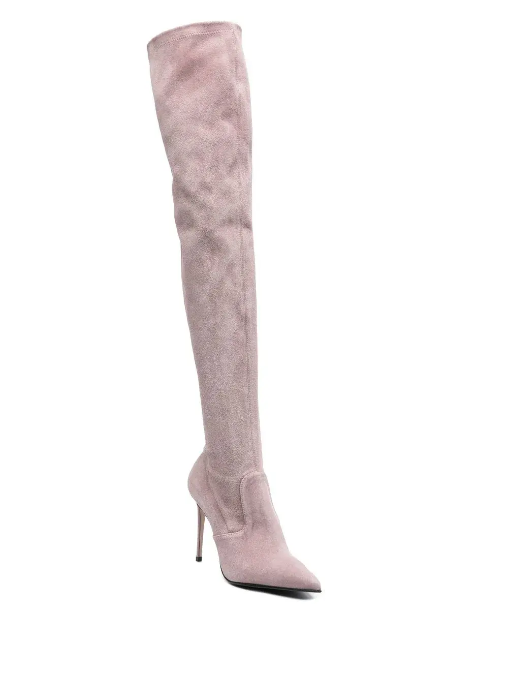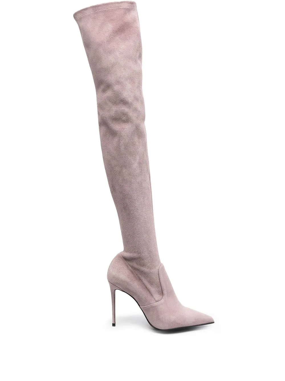 Козья кожа, замша из телячьей кожи, заостренный носок, высота до линии бедра, каблук-шпилька и модель без застежки.
