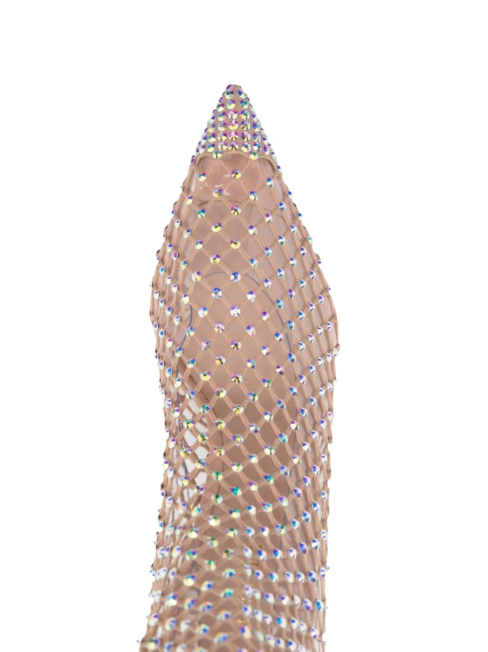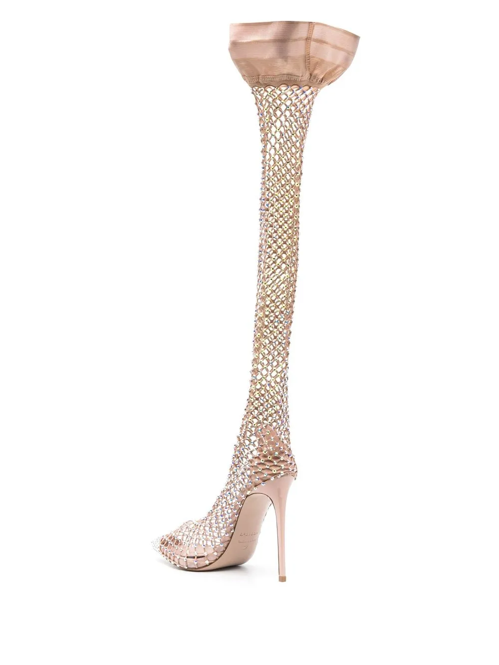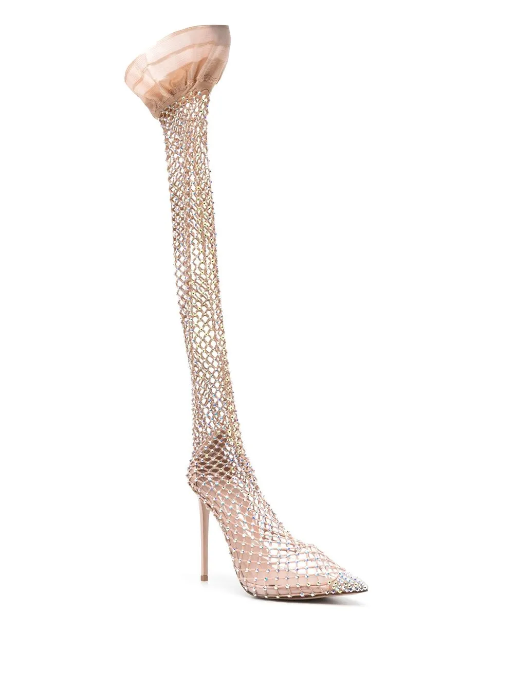 Бежевый, декор из кристаллов, заостренный носок, высота до линии бедра и каблук на высокой шпильке.