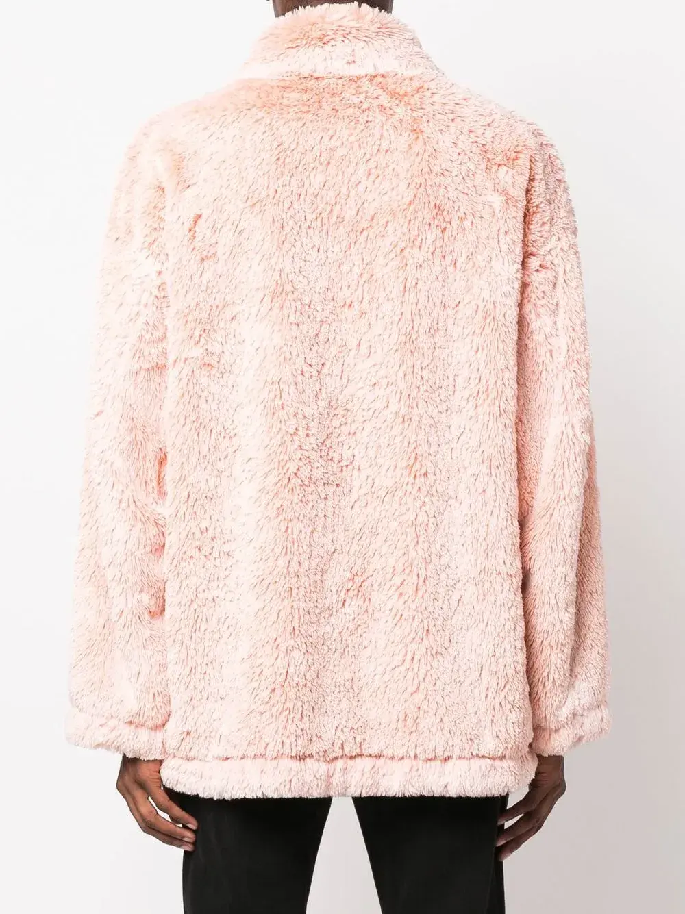 Светло-розовый, искусственная овчина, классический воротник, застежка на пуговицах спереди, длинные рукава и два накладных кармана спереди.
