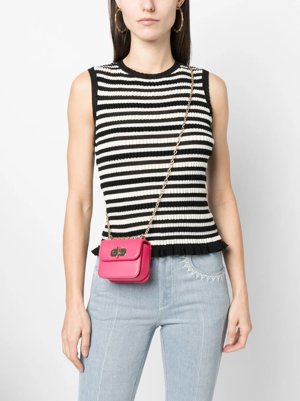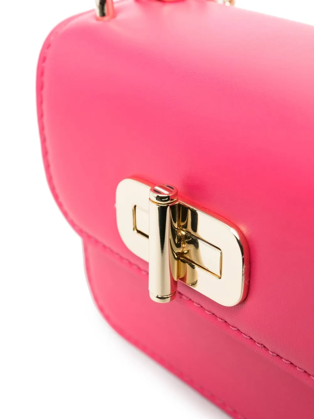 Кораллово-розовый, телячья кожа, золотистый логотип, золотистая фурнитура, застежка с поворотным замком, ремешок-цепочка на плечо, основное отделение и нашивка с логотипом внутри.