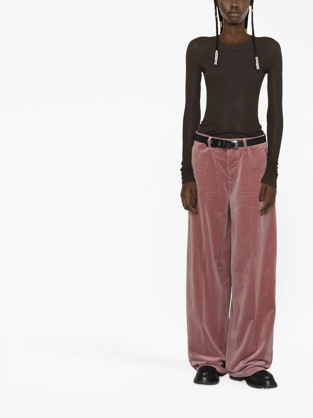Расцветка Blush Pink, смесовый хлопок, бархатный эффект, низкая посадка, застежка на крючок, прорезные карманы по бокам, два кармана с листочкой сзади, широкий крой и длина макси.