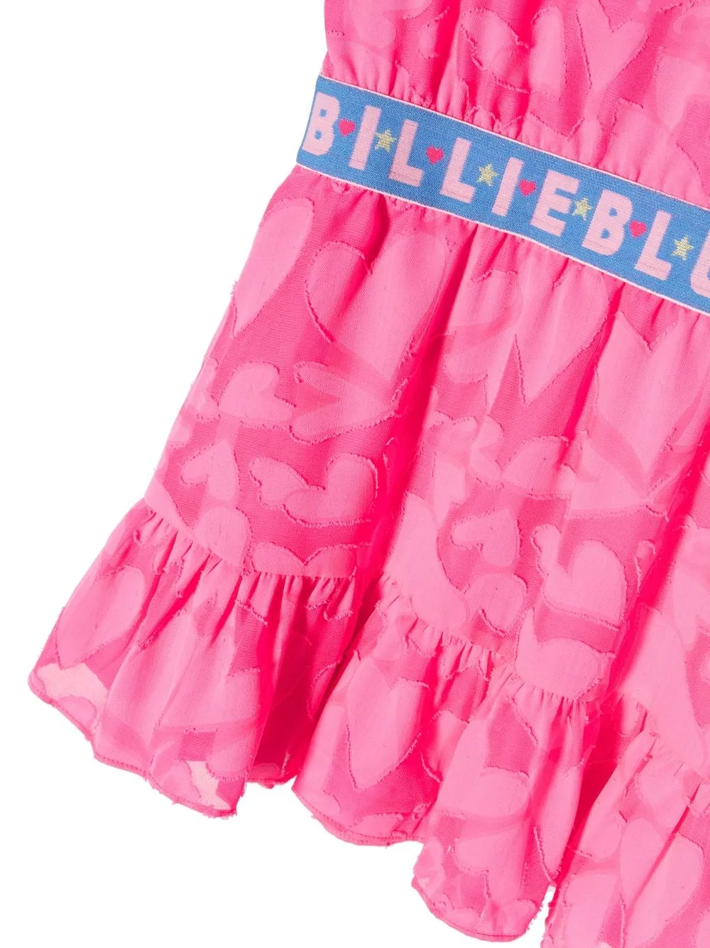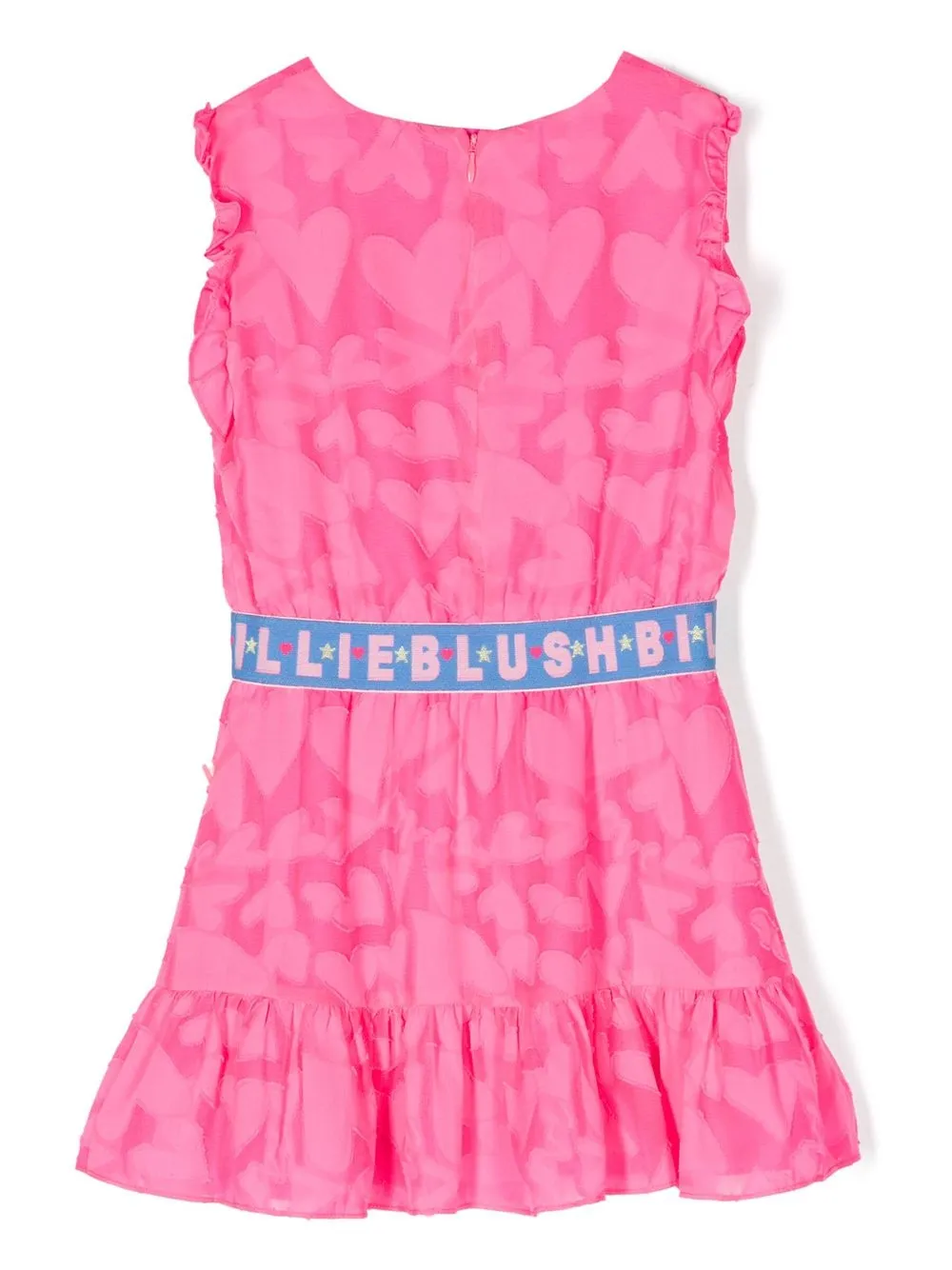 Нежно-розовый, принт с изображением сердца, муаровый узор, дизайн со сборками, пояс с логотипом, круглый вырез, без рукавов, застежка на молнии сзади, расклешенная юбка и прямой подол.
