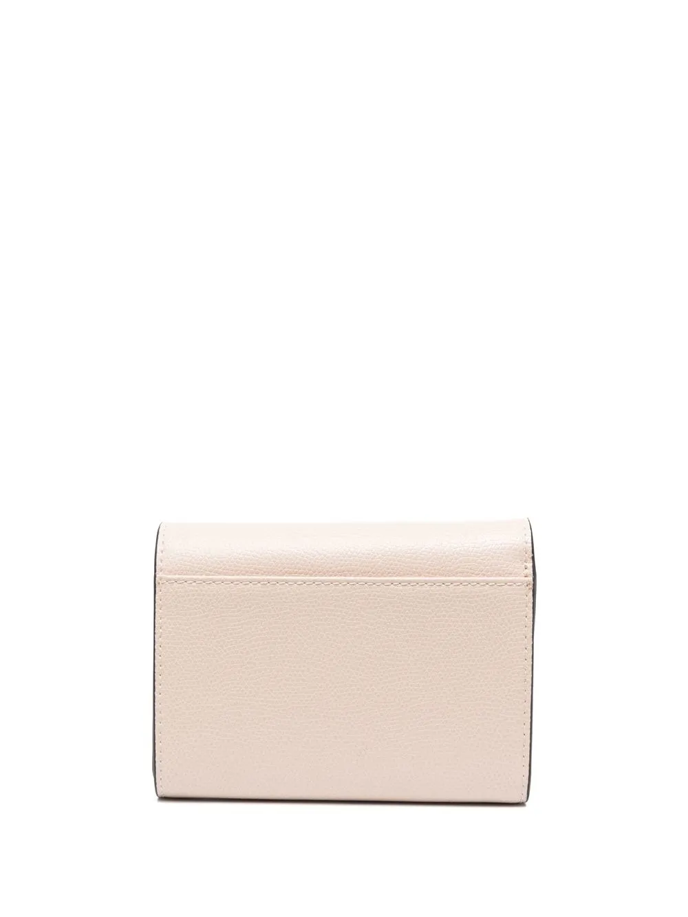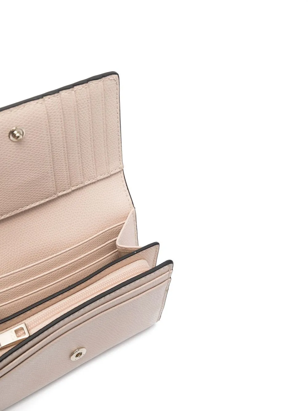 Светло-розовый, кожа, зернистая текстура, золотистый логотип, золотистый металлический логотип, контрастная отделка, откидной верх с застежкой на кнопки, внутренние отделения для карт и внутренний карман на молнии.