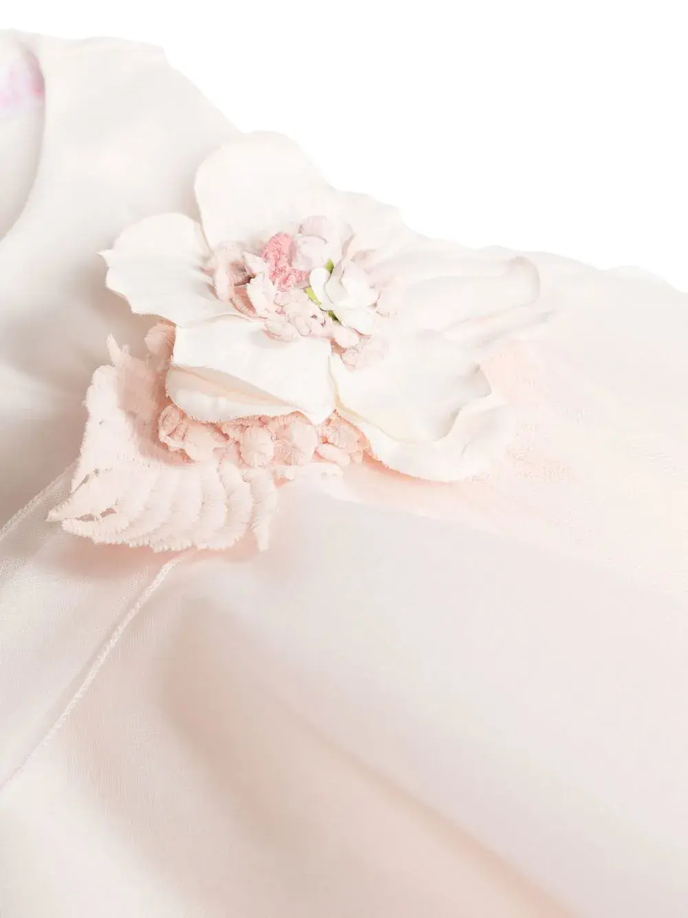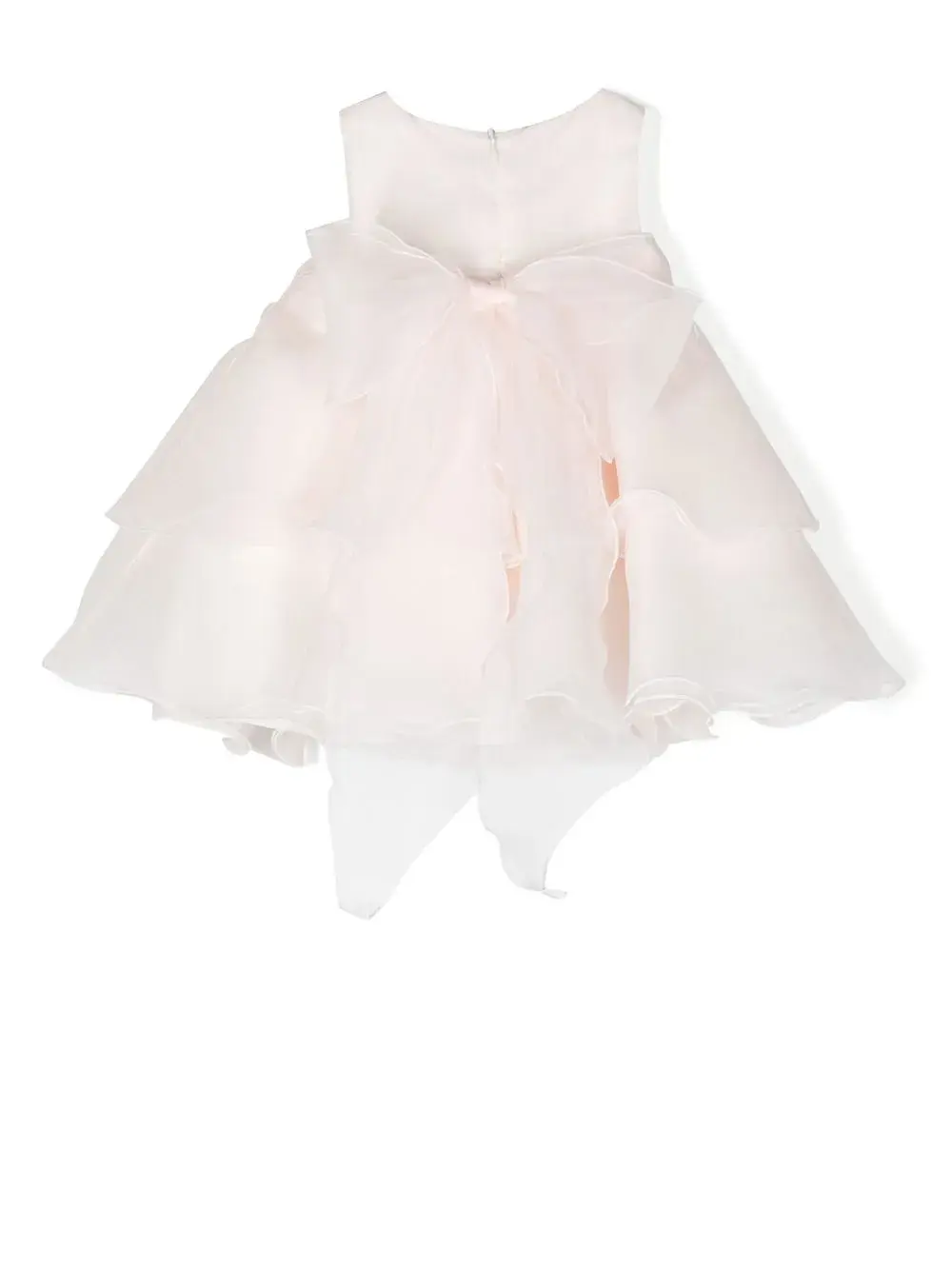 Розовый, смесовый хлопок, верхний слой из тюля, многослойная деталь, цветочная деталь, круглый вырез, потайная застежка на молнии сзади, без рукавов, кулиска на талии, ярусная юбка и волнистые края.