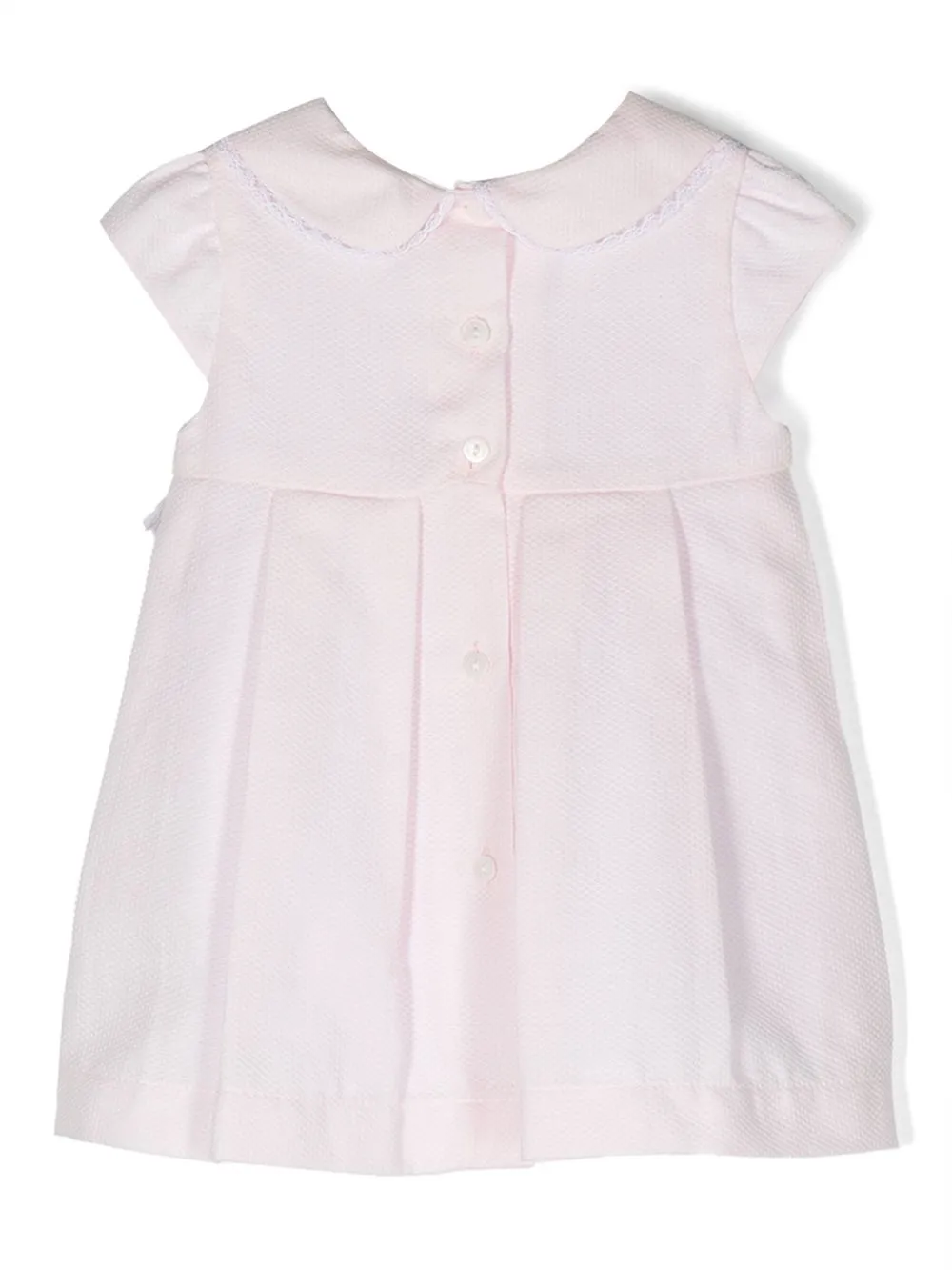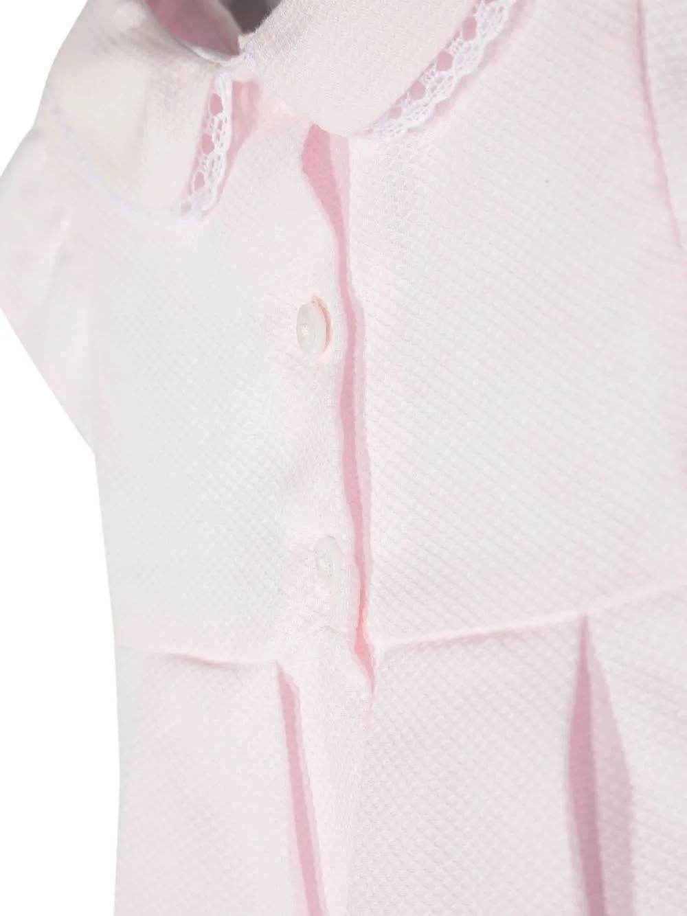 Светло-розовый, белый, хлопок, бант, вставки из кружева, рукава кап, закругленный воротник, застежка на пуговицы сзади, плиссированная юбка и прямой подол.