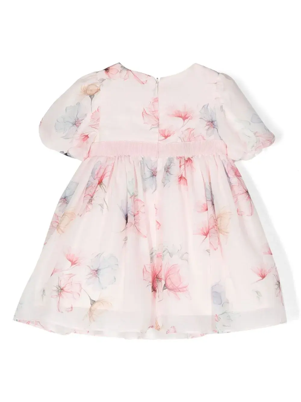 Светло-розовый, смесовый хлопок, сплошной цветочный принт, юбка-колокол, круглый вырез, застежка на молнии сзади, короткие рукава, контрастный пояс и вставки с оборками.
