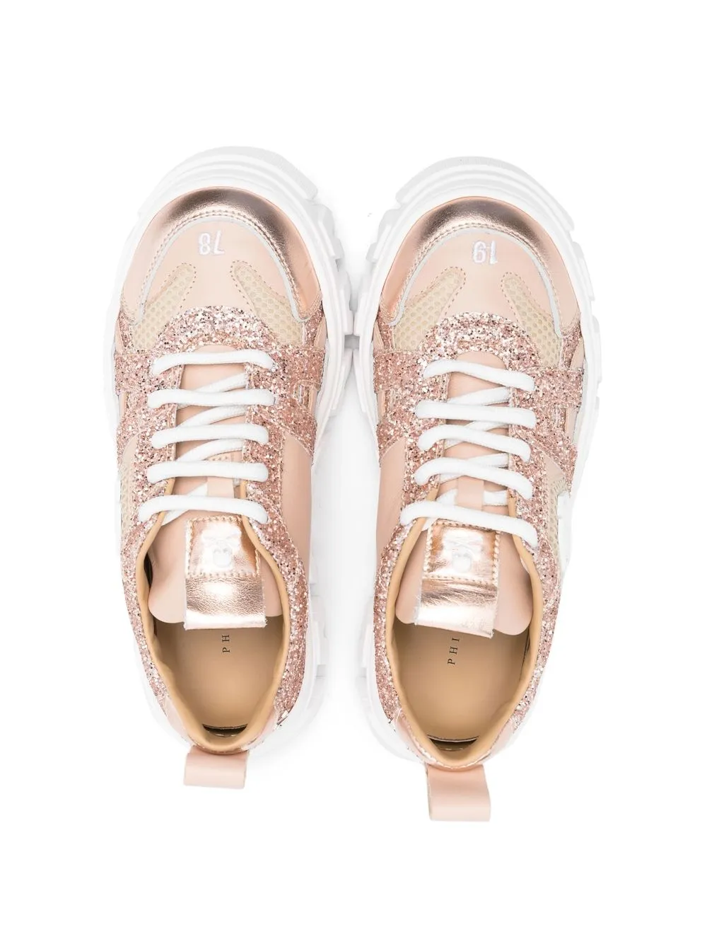 Розовый, телячья кожа, эффект металлик, нашивка с логотипом сбоку, шнуровка спереди, закругленный носок и массивная резиновая подошва.