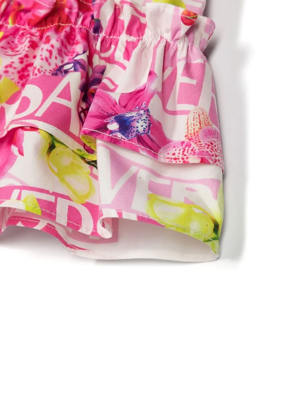 Розовый, хлопок, сплошной цветочный принт, сплошной принт с логотипом, вставки с оборками и ярусная юбка.