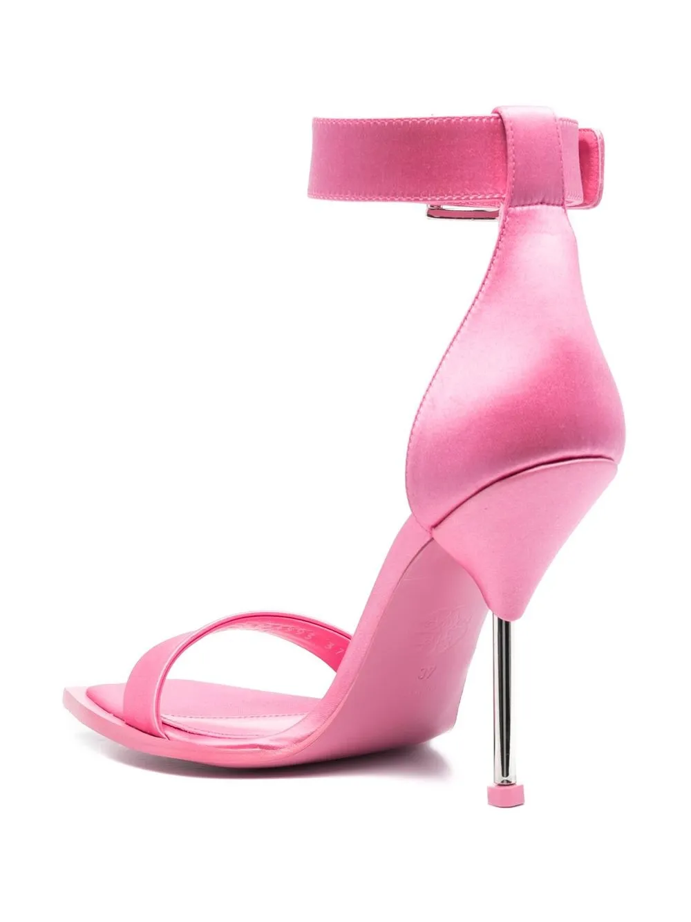 Сатиновая фактура, ремешок на щиколотке с пряжкой, перекрестные ремешки, открытый носок и стелька с логотипом.