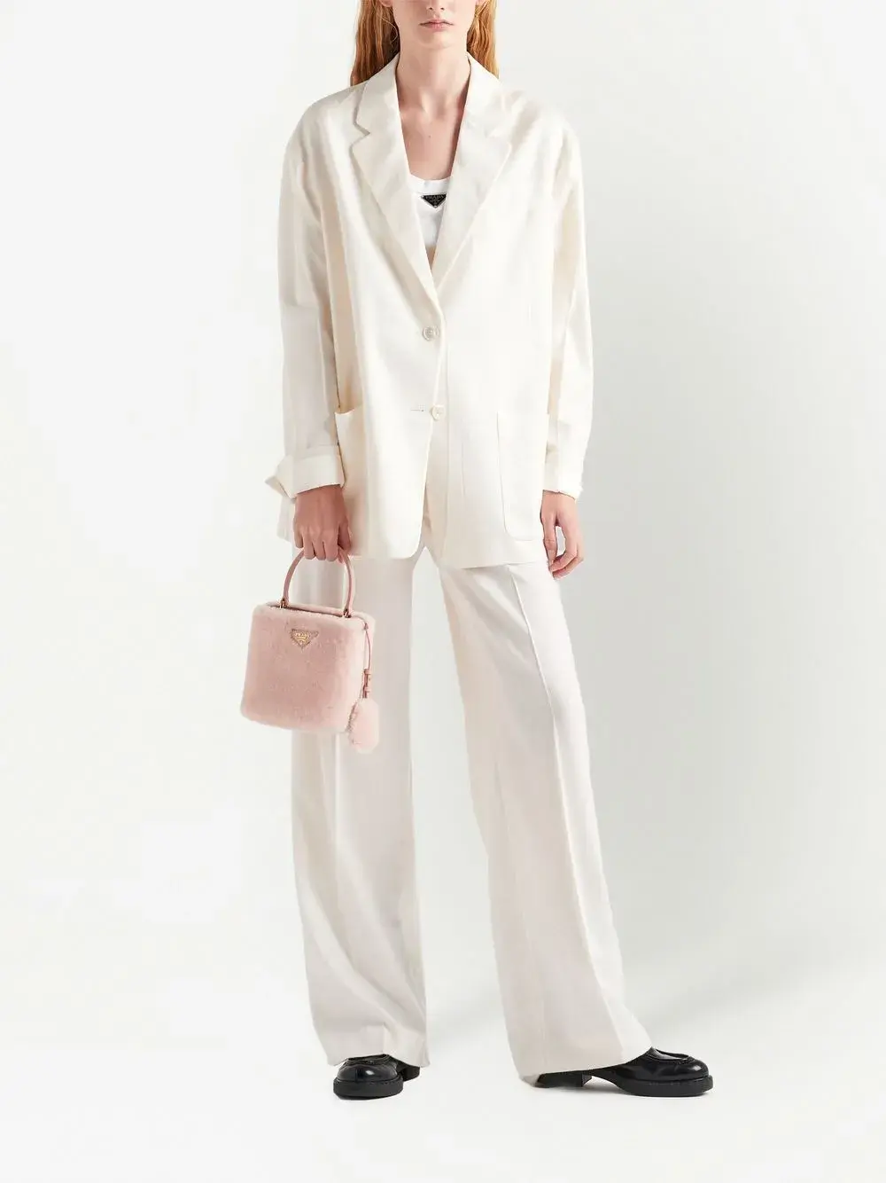 Светло-розовый, кожа, треугольный логотип, крепление для ключей, магнитная застежка, несколько отделений, ручка с плоским верхом и съемный регулируемый ремень на плечо. Ответственный выбор: Этот товар как минимум на 50% состоит из переработанных или повторно использованных материалов.
