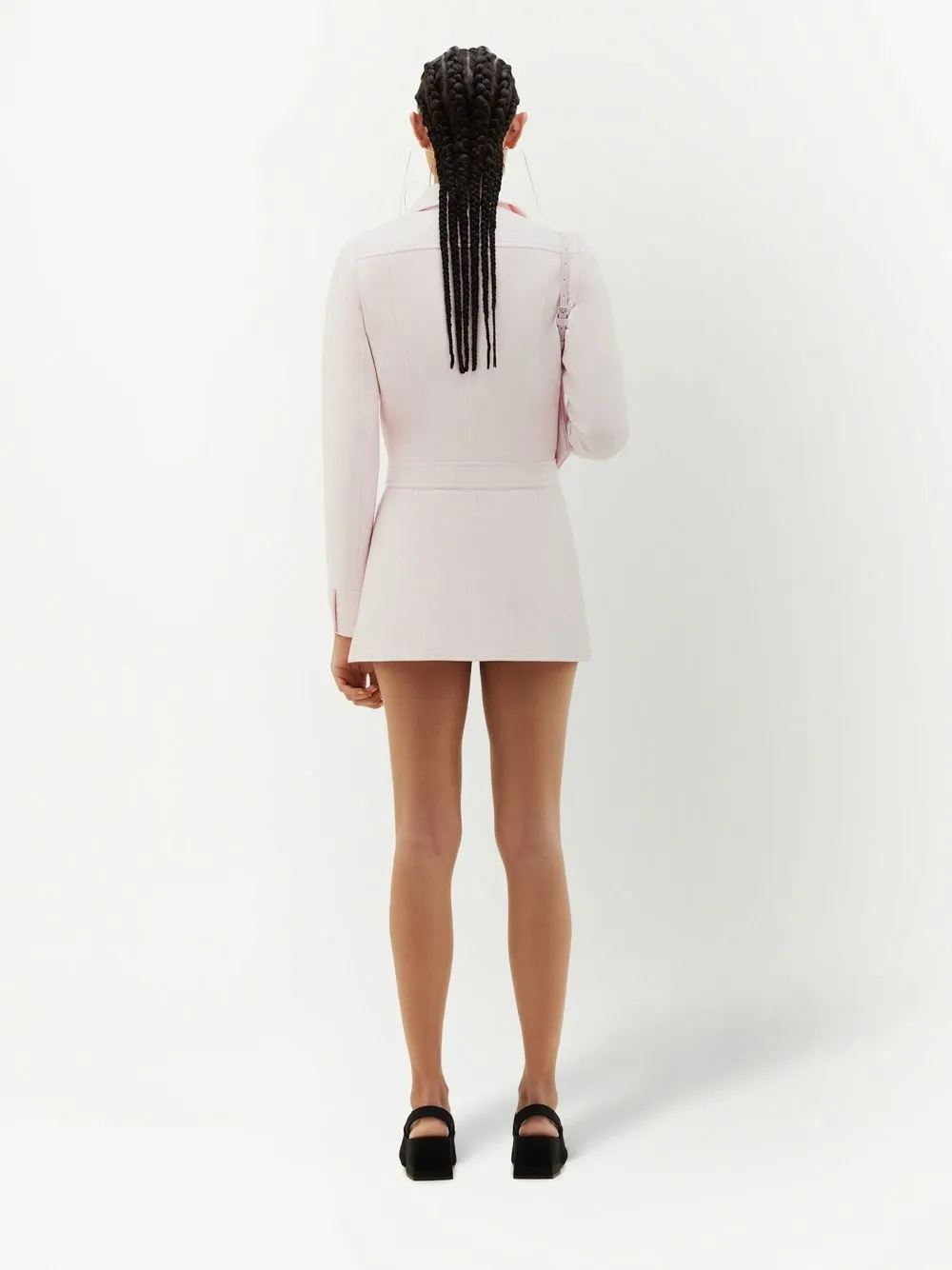 Светло-розовый, эластичный хлопок, нашивка с логотипом на груди, застежка на кнопках спереди, длинные рукава и прямой подол.
