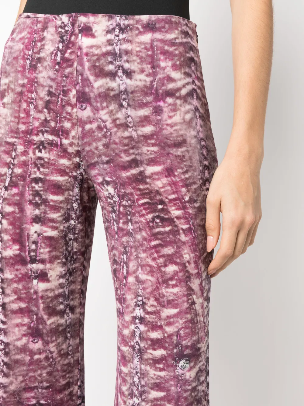 Темно-розовый, эластичный материал, сплошной графичный принт, прямой крой и завышенная талия.