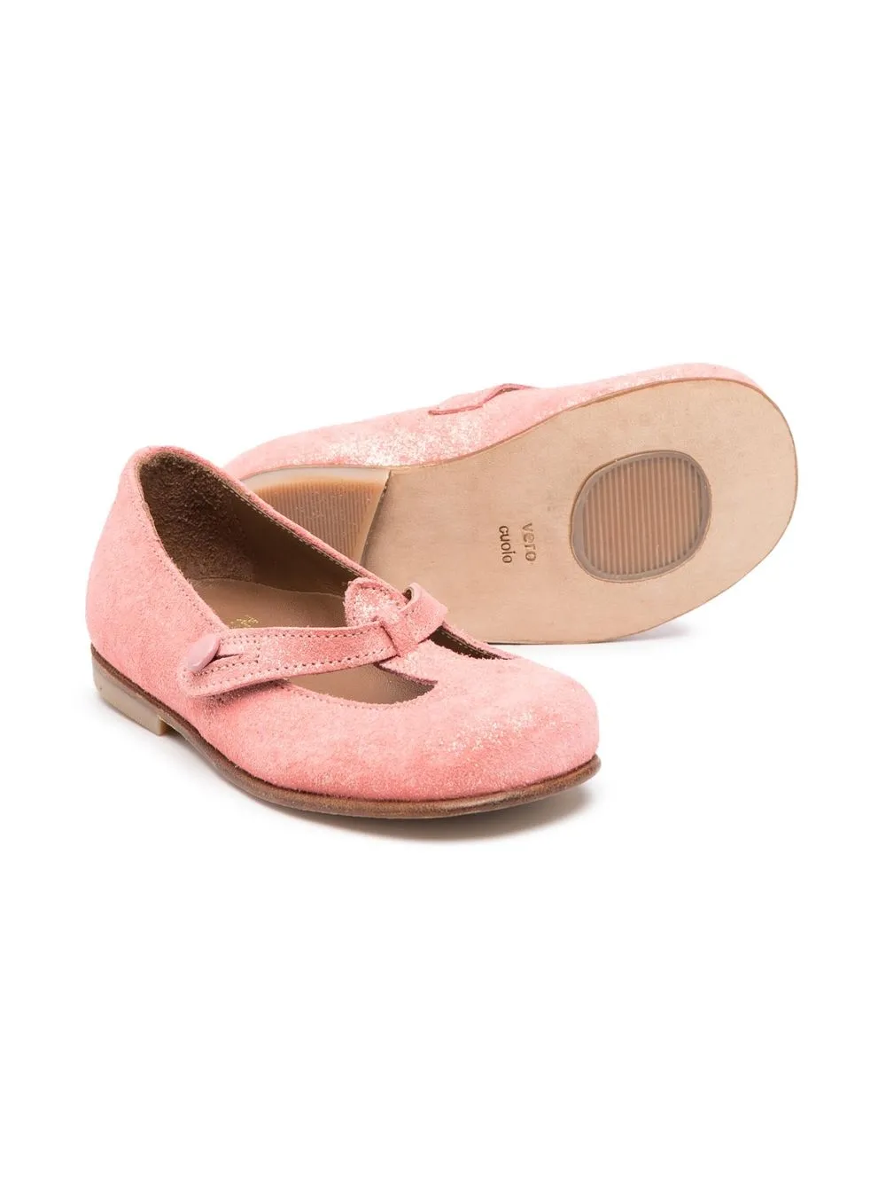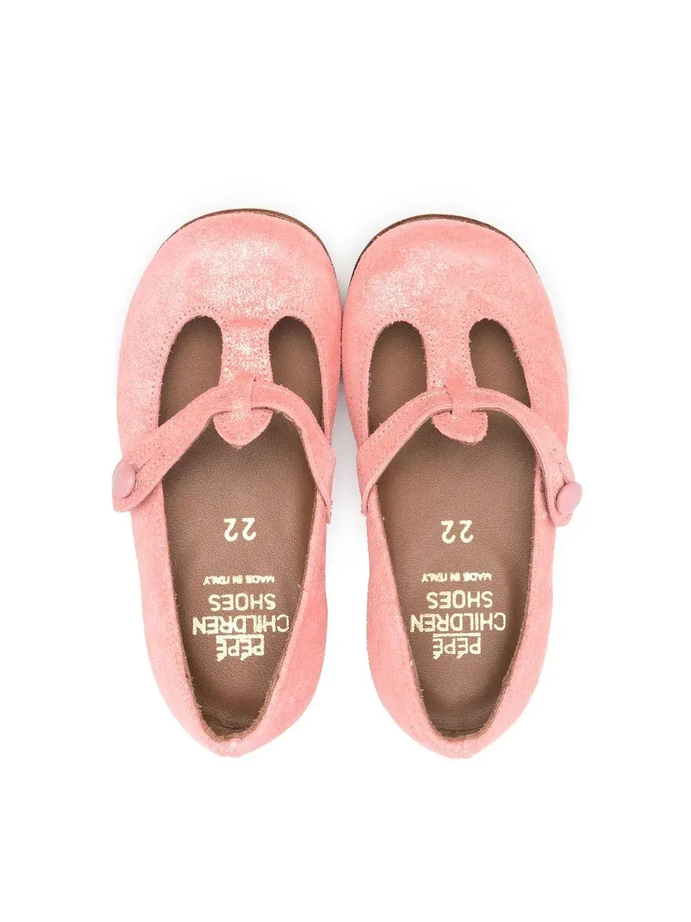 Лососевый, замша из телячьей кожи, бретели с застежками на пуговицах, Т-образный ремешок, закругленный носок и резиновая подошва.