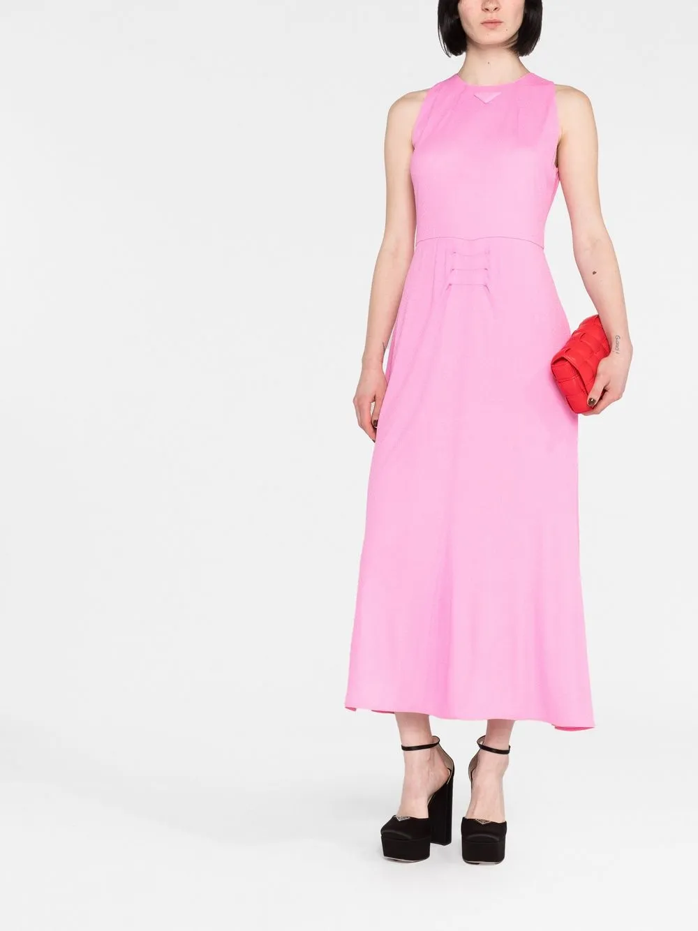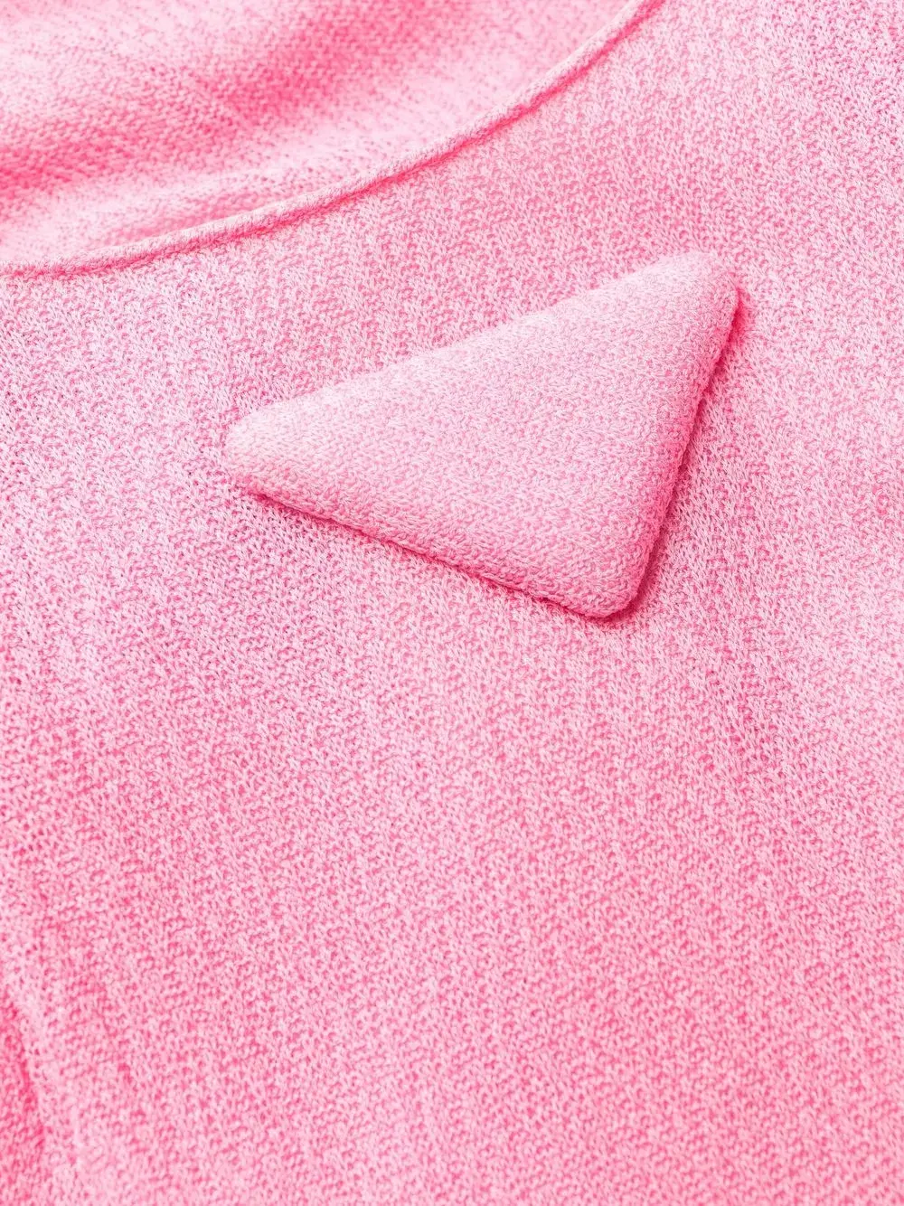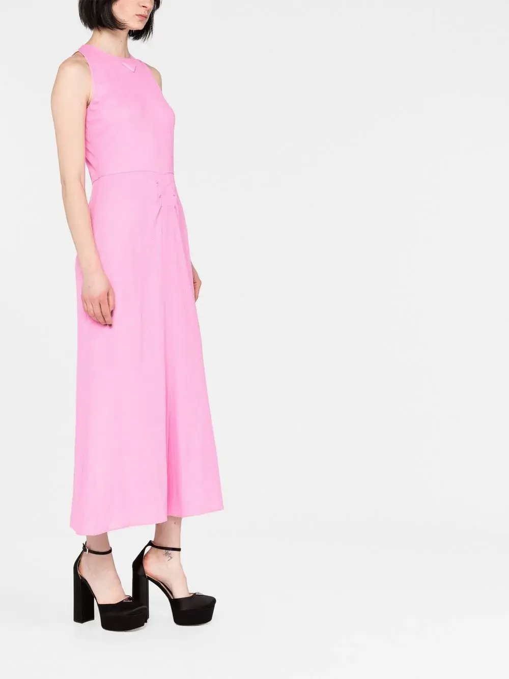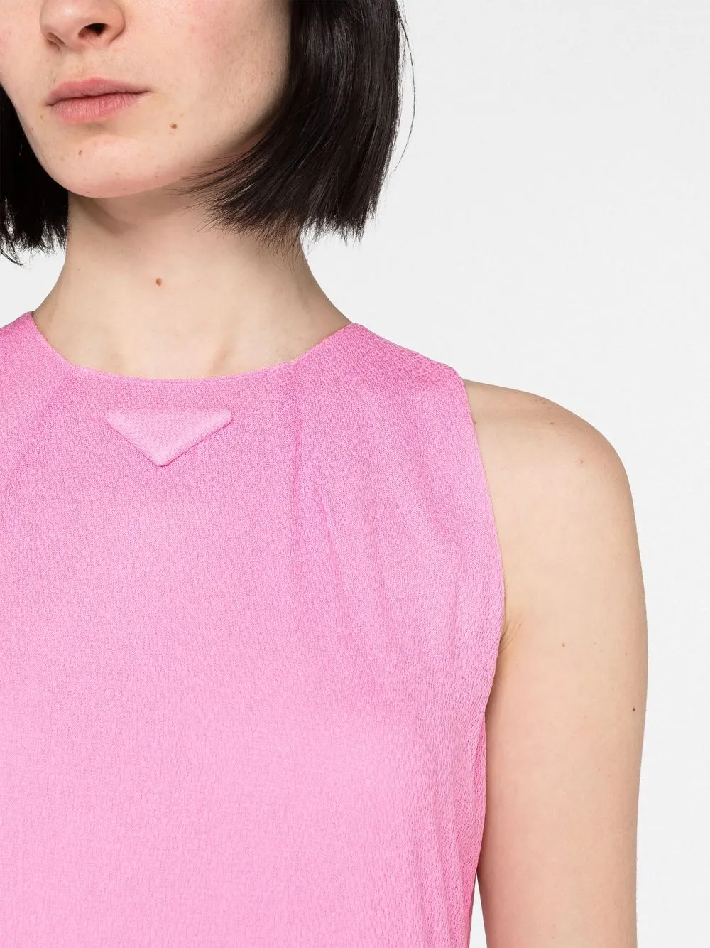 Розовый, креповая текстура, треугольный логотип, круглый вырез, без рукавов, дизайн со сборками, драпировка и прямой подол.