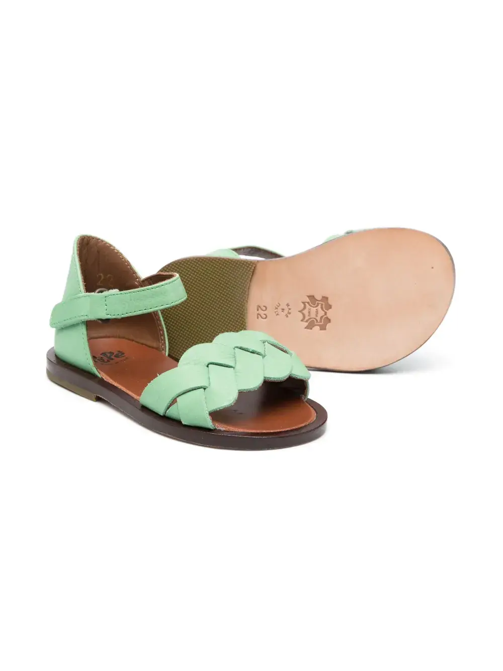 Мятно-зеленый, телячья кожа, плетеный ремень, открытый носок, ремешок на щиколотке с пряжкой, кожаная стелька с логотипом и плоская кожаная подошва.