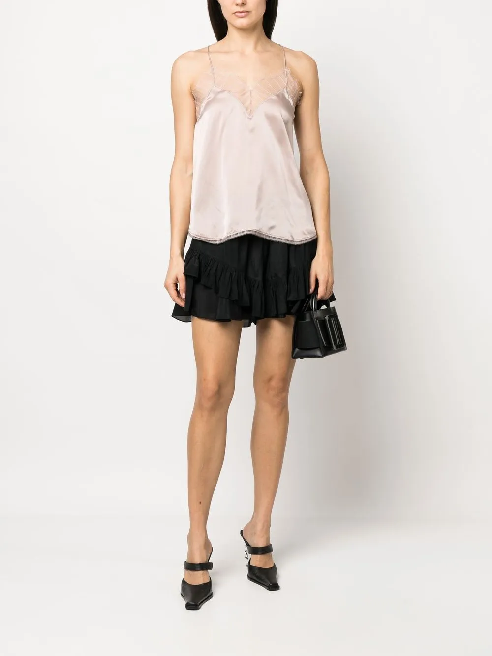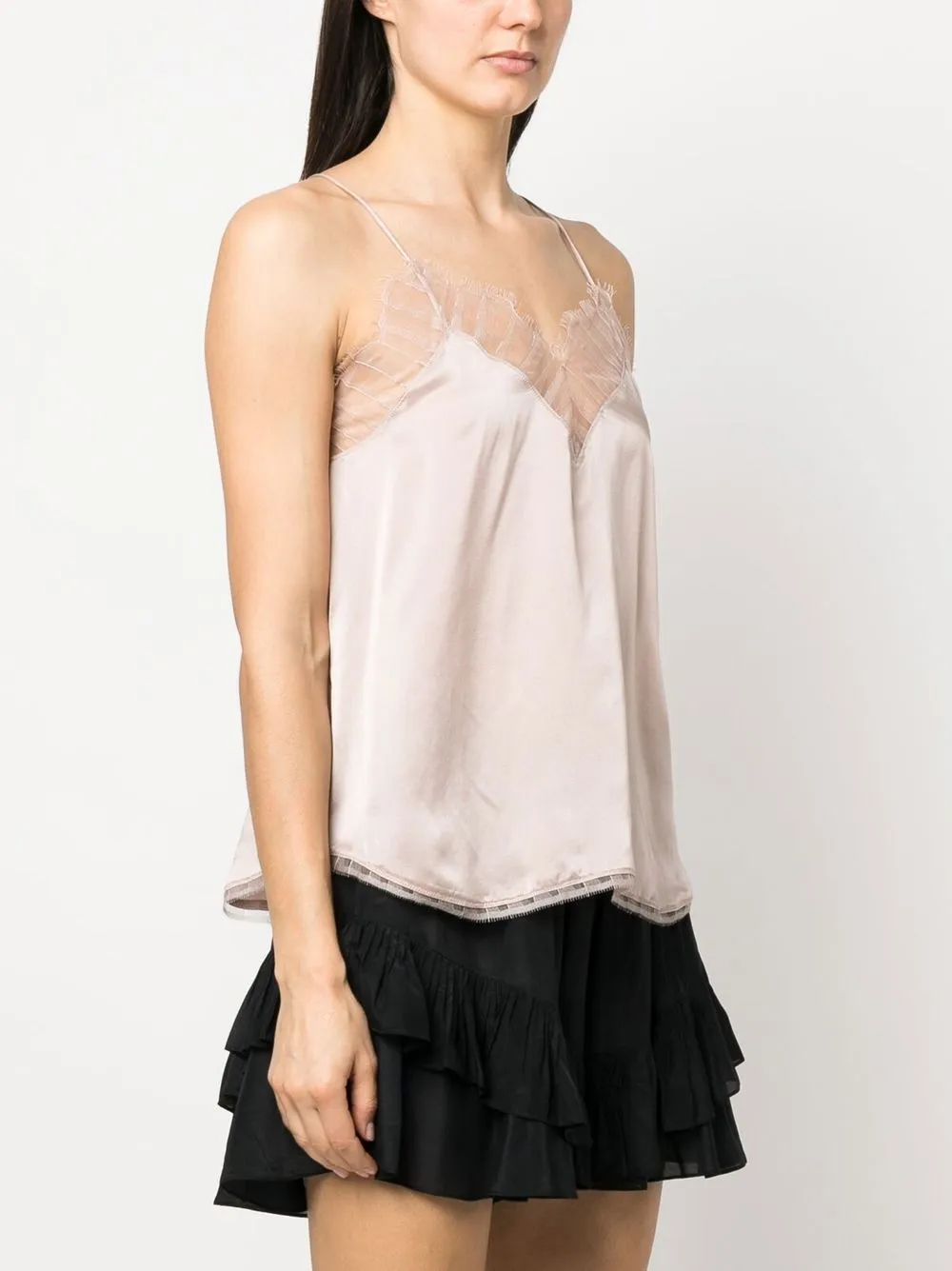 Пудрово-розовый, шелк, вставки из кружева, V-образный вырез, V-образный вырез сзади и тонкие ремешки.