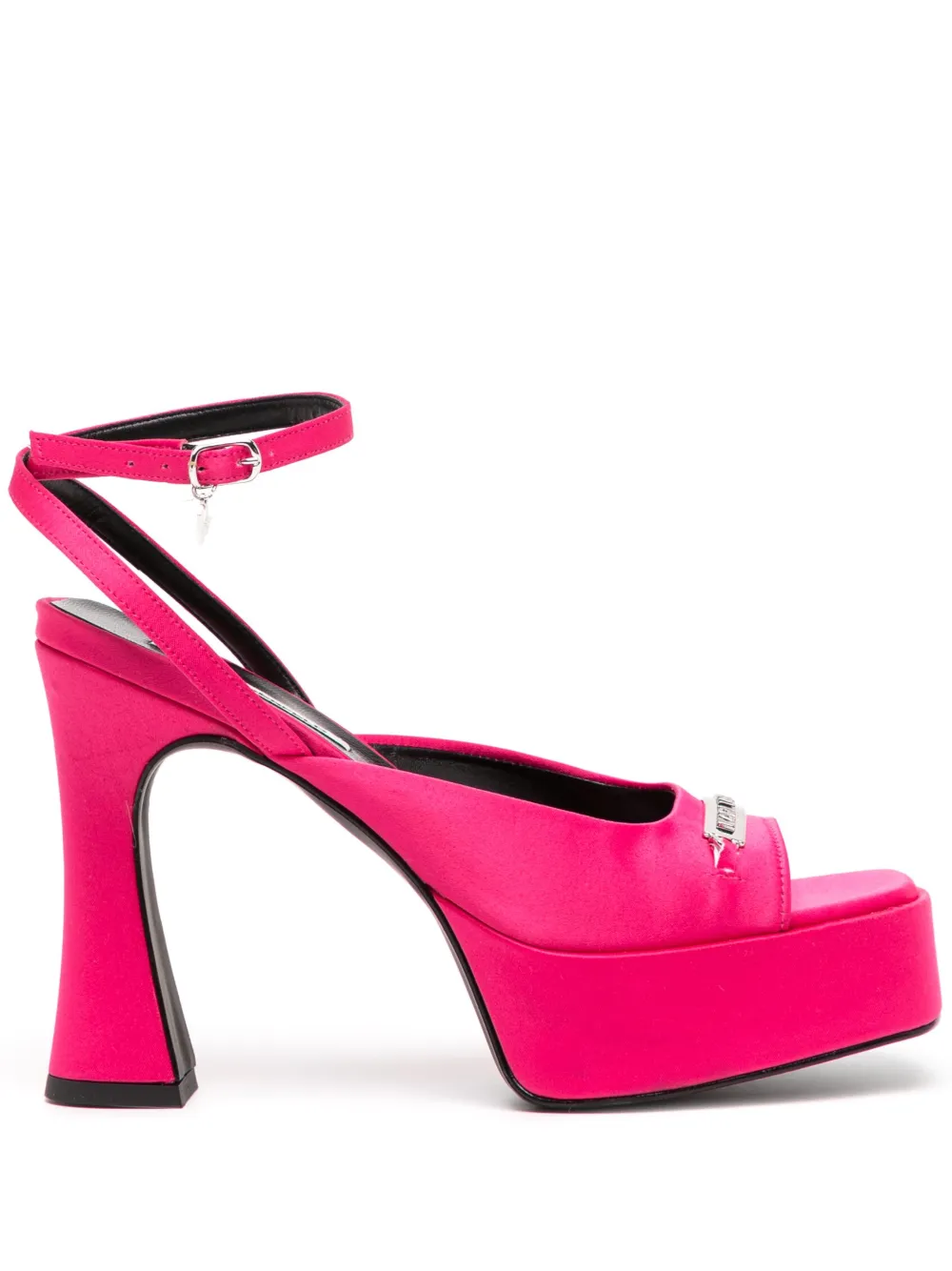 Малиновый, кожа, сатиновая фактура, выгравированный логотип, открытый носок, ремешок на щиколотке с пряжкой, логотип на стельке, высокий блочный каблук и кожаная подошва.