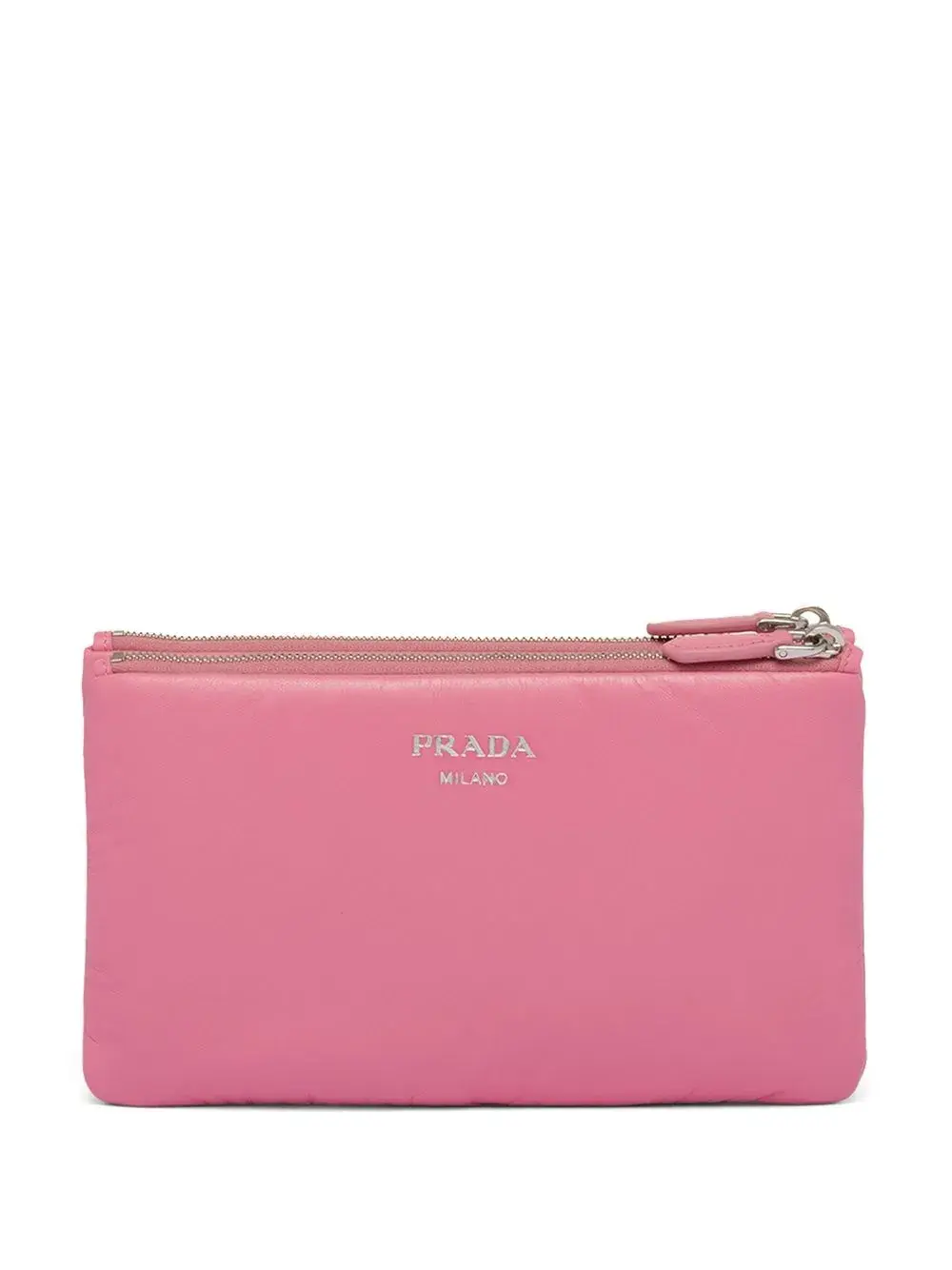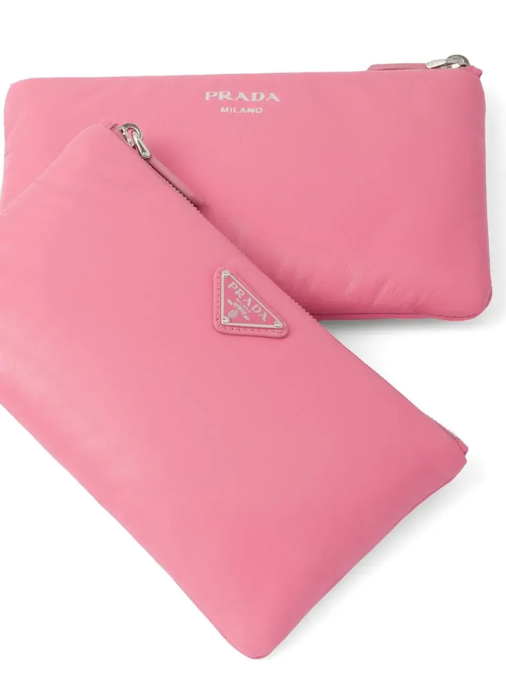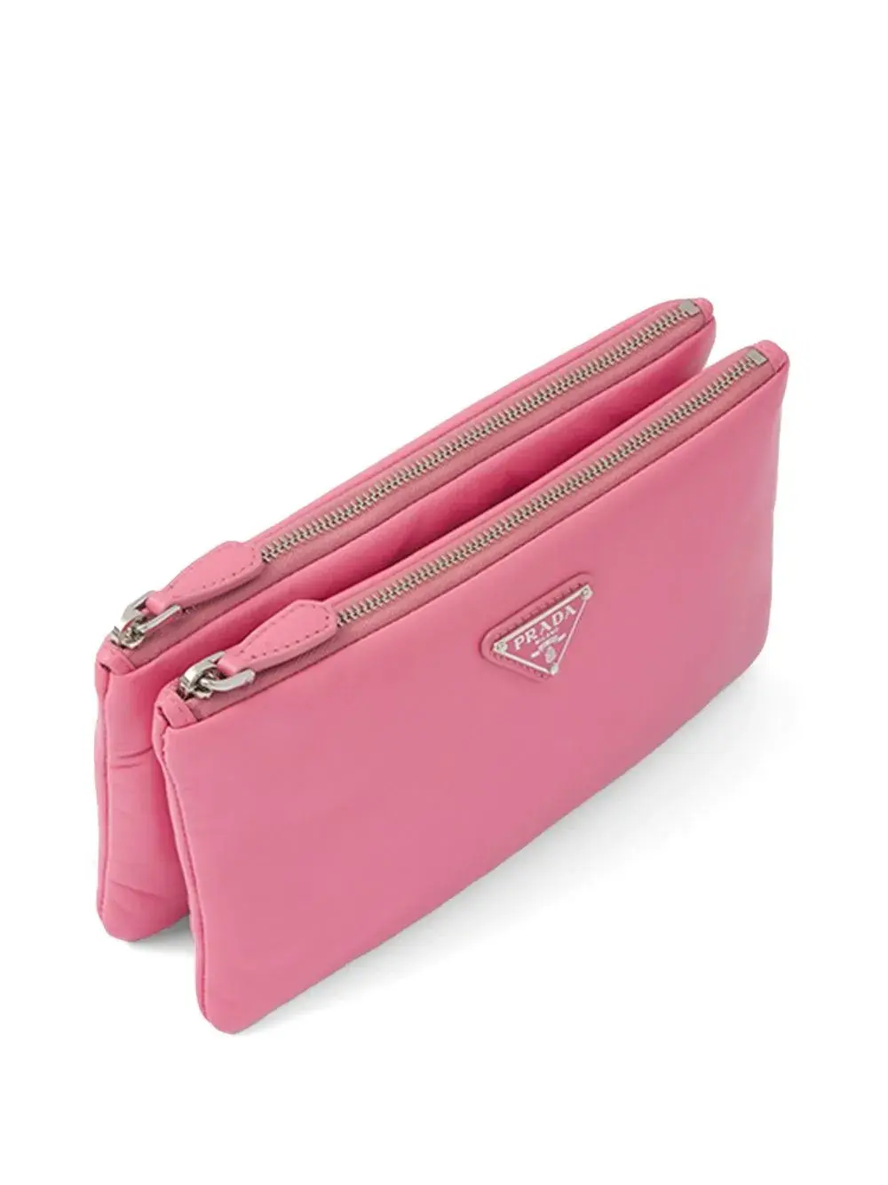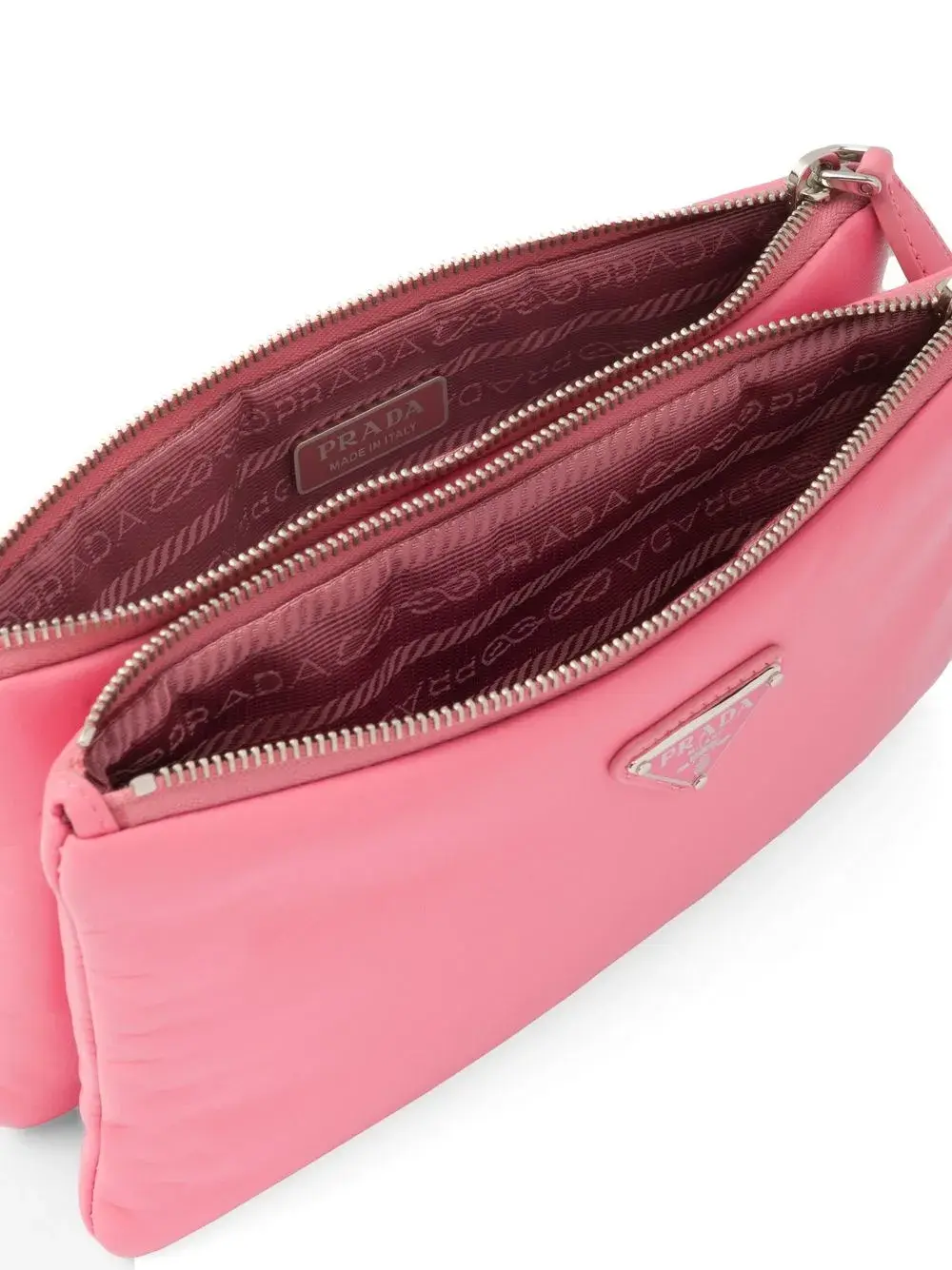 Нежно-розовый, кожа наппа, треугольный эмалированный логотип, тисненый логотип сзади, прямоугольная форма, застежка на молнии сверху и основное отделение.