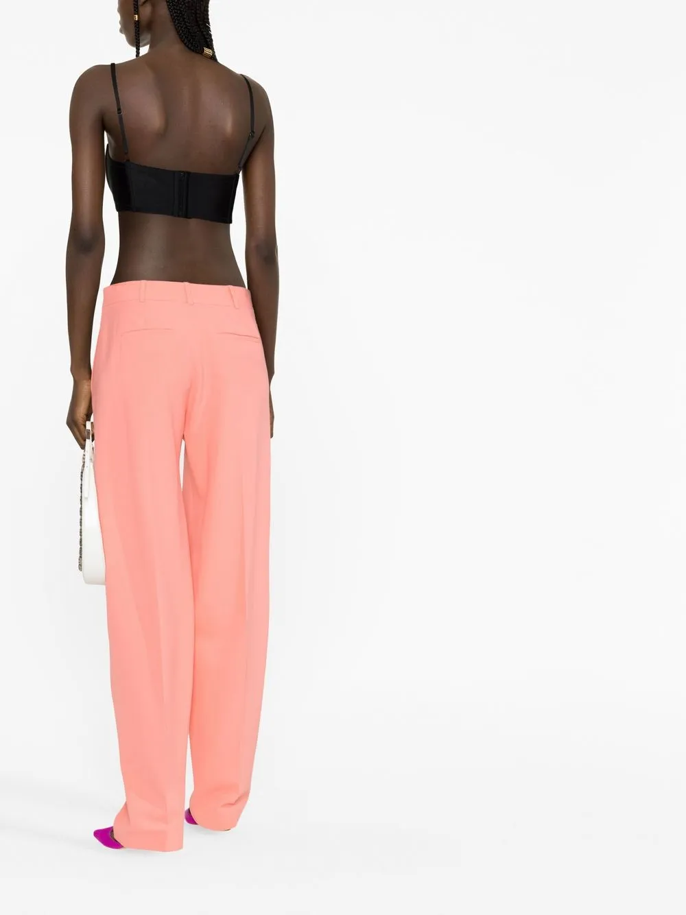Лососевый, петли для ремня, стрелки, потайная застежка спереди и два кармана с листочкой сзади.