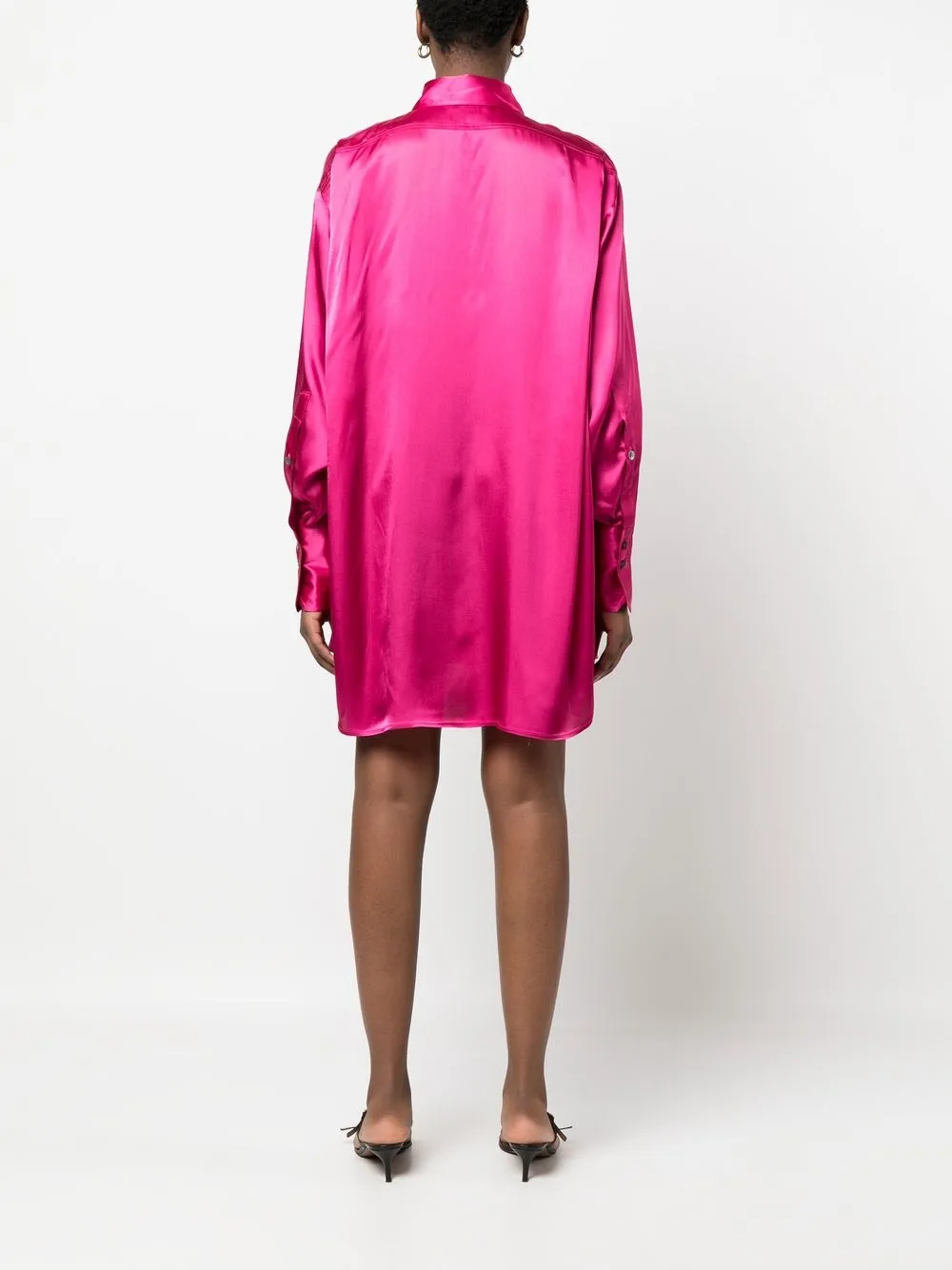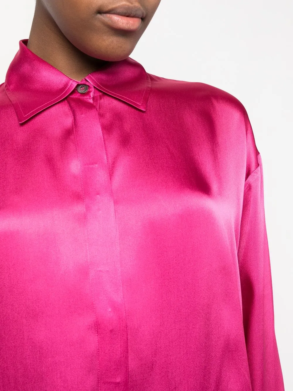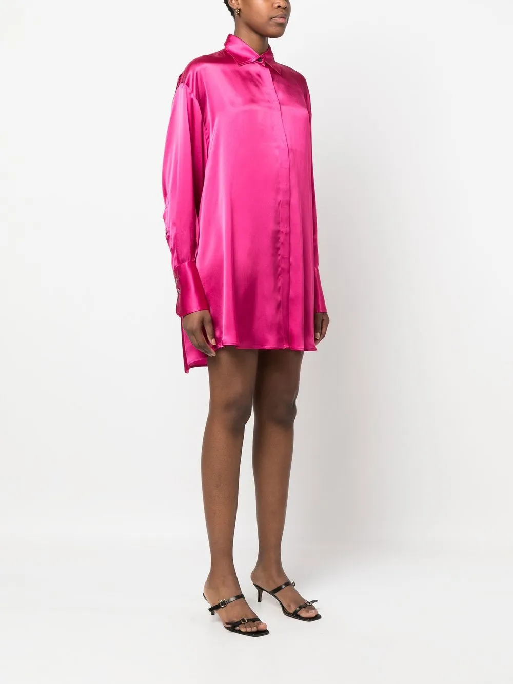 Темно-розовый, смесовый шелк, классический воротник, потайная застежка спереди, длинные рукава и прямой подол.