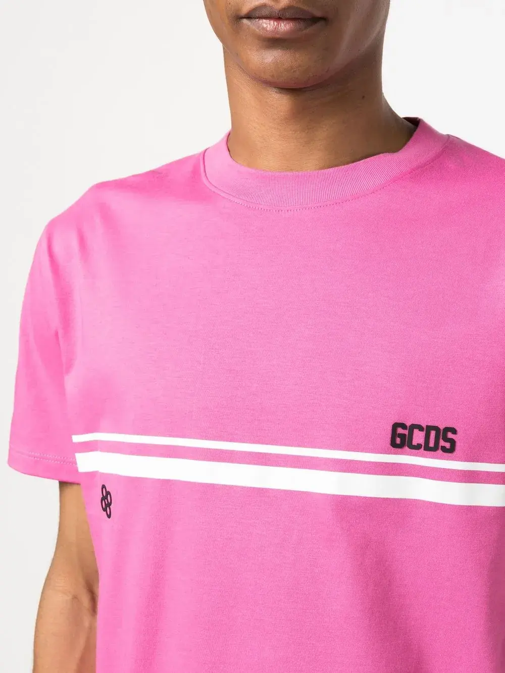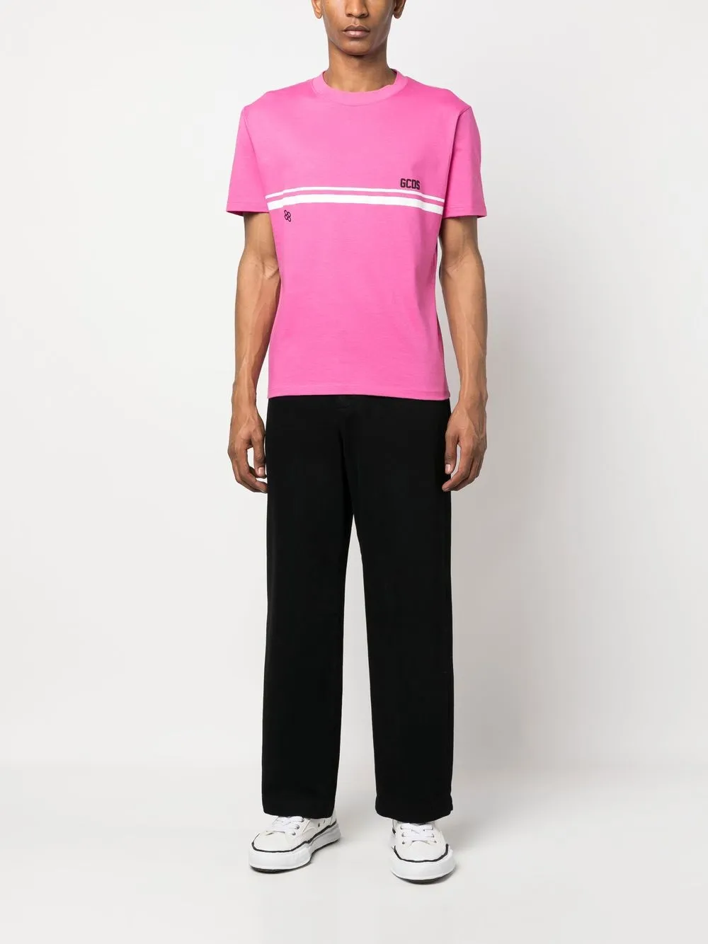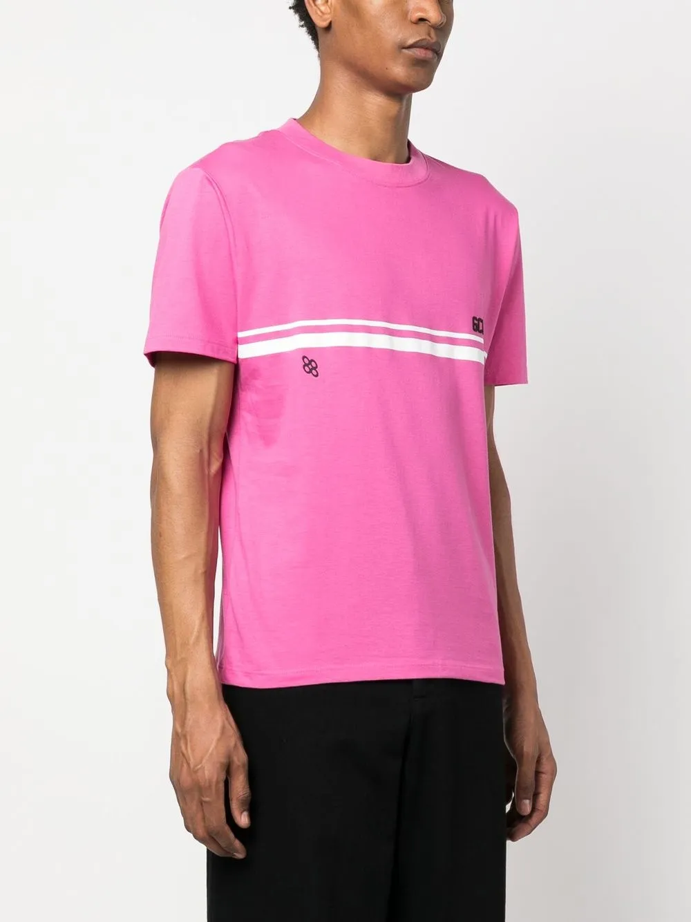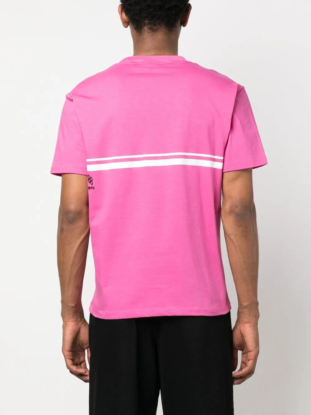 Темно-розовый, хлопок, ткань джерси, принт с логотипом на груди, полоски, круглый вырез, короткие рукава и прямой подол.