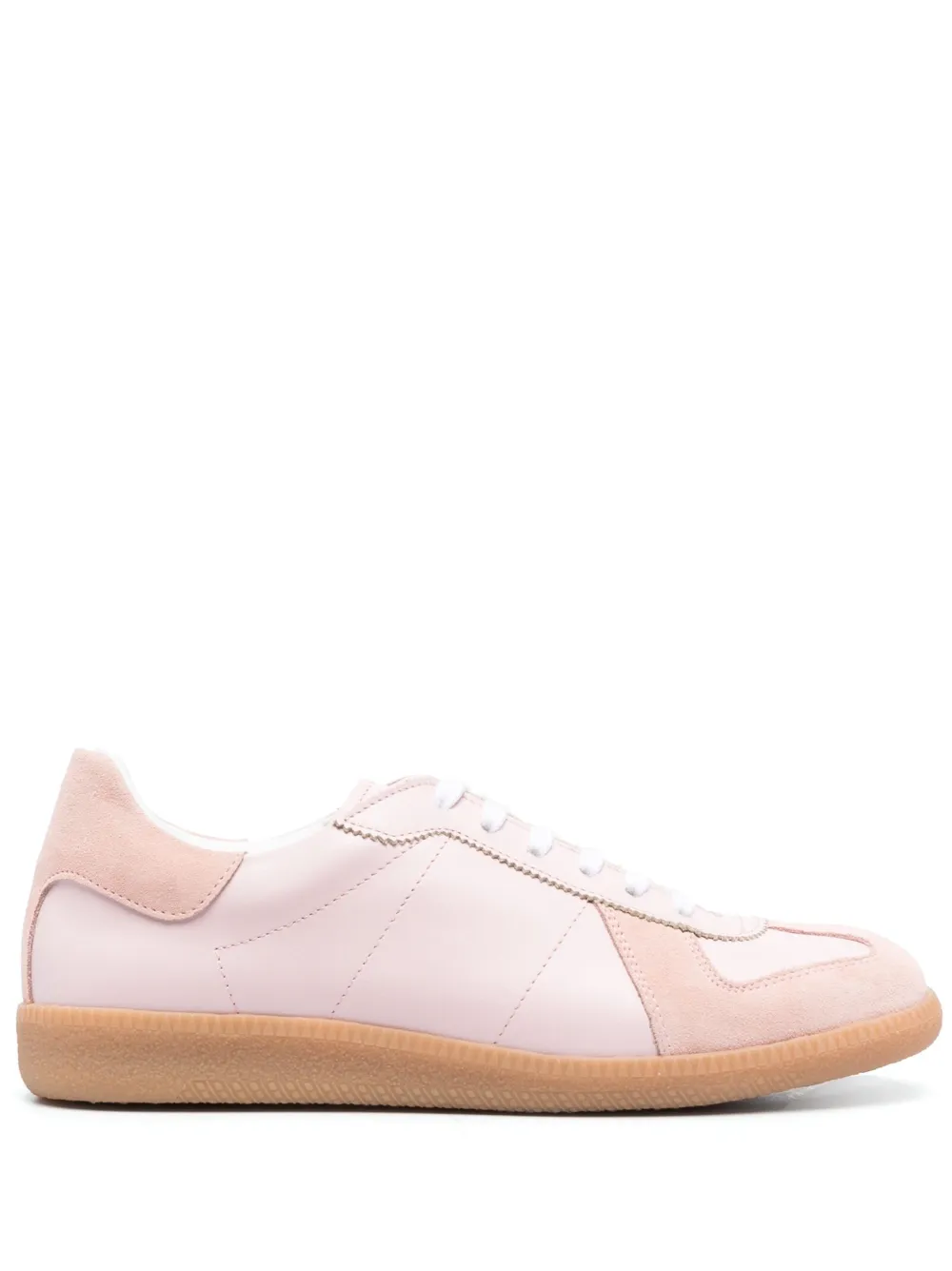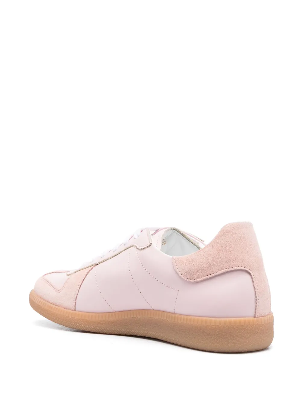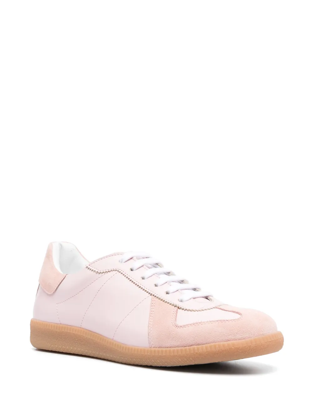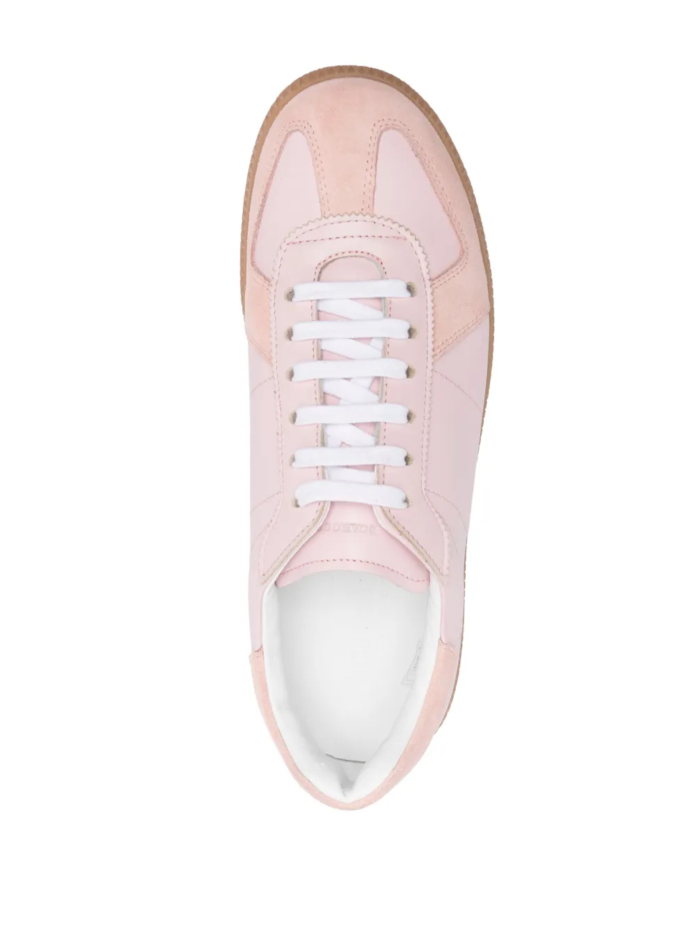 Розовый, телячья кожа, вставки, закругленный носок, шнуровка спереди и плоская резиновая подошва.
