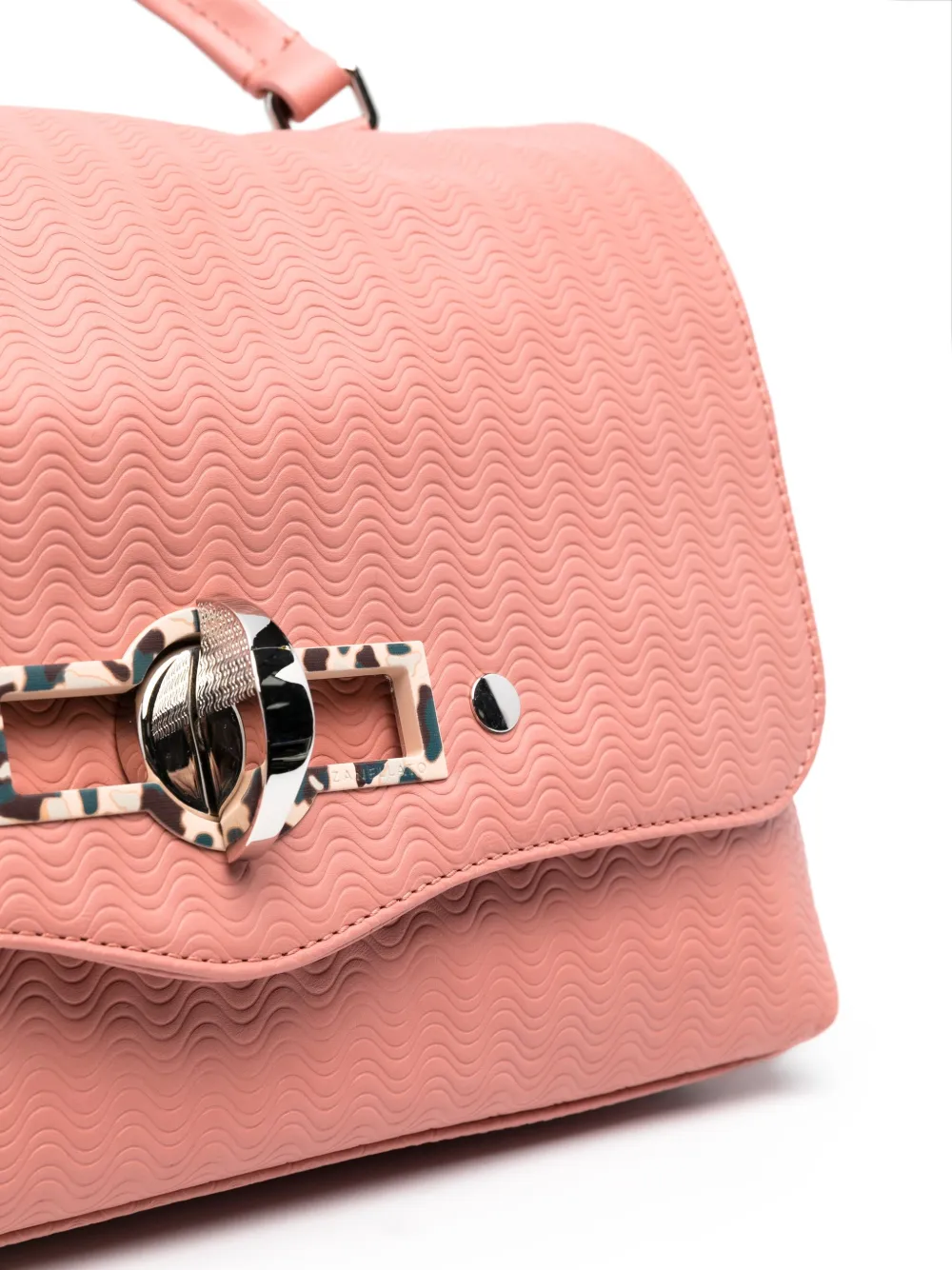 Кораллово-розовый, кожа, фактурная отделка, серебристые заклепки, серебристая фурнитура, верхняя ручка, откидной клапан и основное отделение.